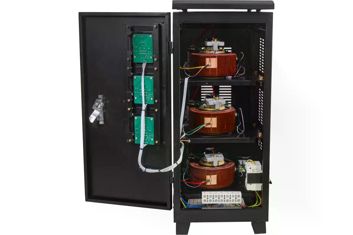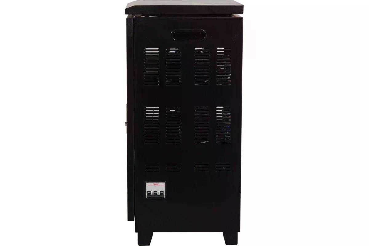 Надёжная конструкция стабилизатора оснащена естественной системой охлаждения и прочным корпусом с классом защиты IP20. Устройство предназначено для напольного размещения. Современный интерфейс с LED-дисплеем позволяет легко контролировать все параметры работы устройства.