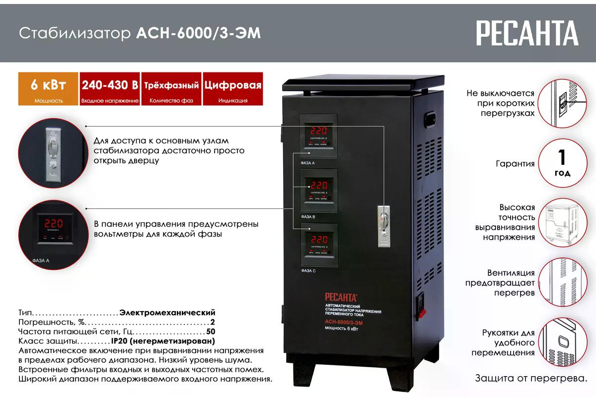 Стабилизатор напряжения Ресанта АСН-6000/3-ЭМ представляет собой современное устройство, способное обеспечивать надёжную защиту электрооборудования мощностью до 6 кВт в трехфазной сети. Благодаря электромеханической технологии прибор гарантирует высокую точность — всего ±2% от номинального значения 380 В.