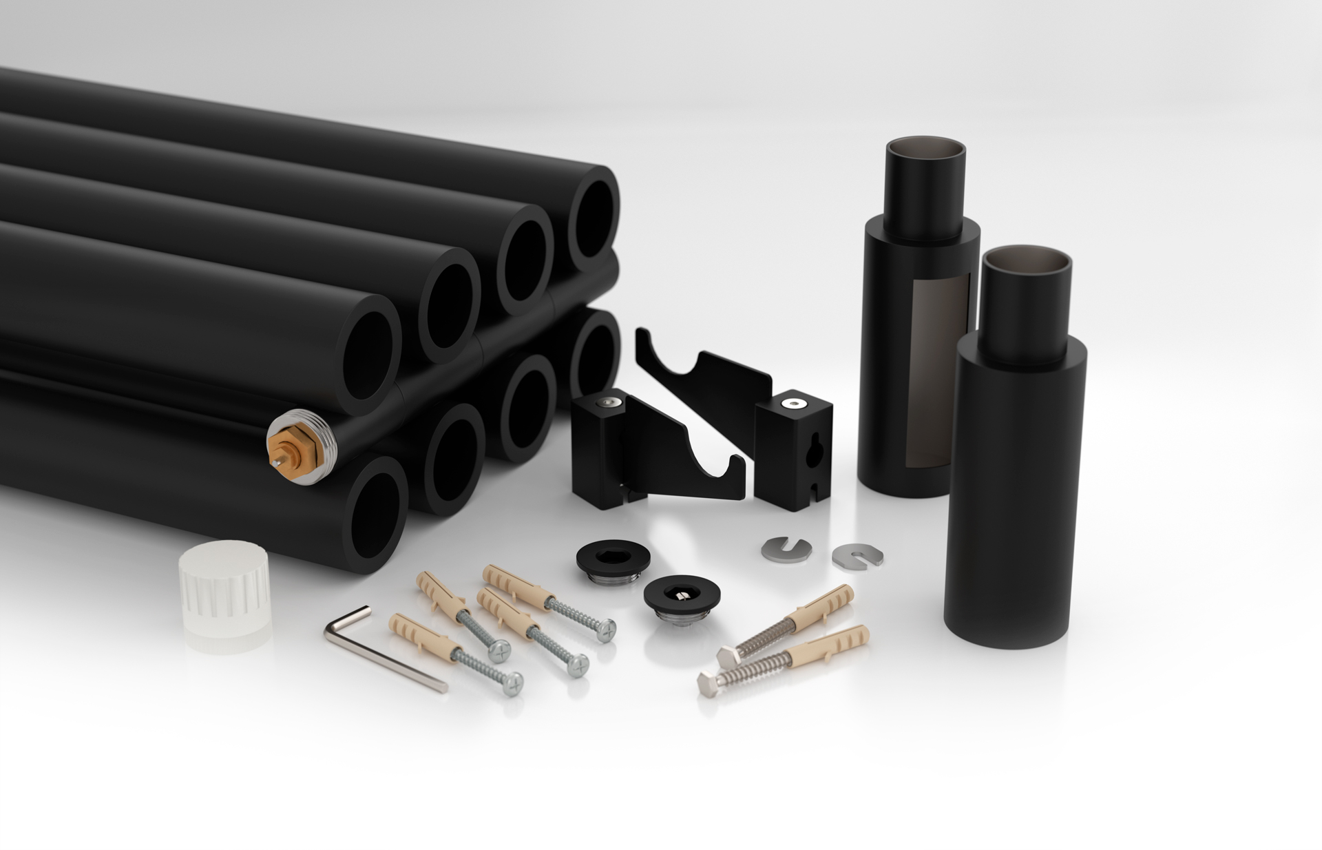 Состав поставки: полотенцесушитель, спускной клапан, отражатели, эксцентрики и опоры кронштейнов, комплект прокладок, шестигранные ключи, дюбели и саморезы