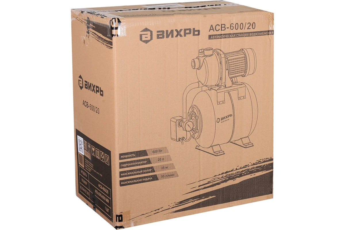Автономная станция водоснабжения Вихрь АСВ-600/20 [68/1/12] отлично подходит для частных домов, но при этом может применяться даже в небольших хозяйствах. Благодаря центробежному насосу на 600 Вт, легко поднимает воду на высоту до 35 м. Станция способна перекачивать до 55 л/мин, поэтому без проблем поддерживает необходимое давление в системе водоснабжения. Устройство может использоваться для скважин и колодцев глубиной до 9 м.