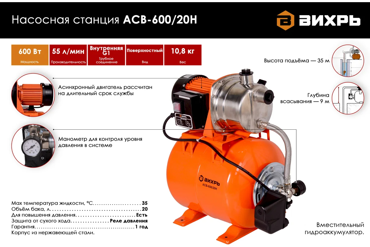 Компактная, удобная в использовании насосная станция Вихрь АСВ-600/20Н станет оптимальным решением в местах, где отсутствует централизованный водопровод.