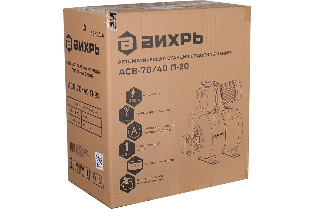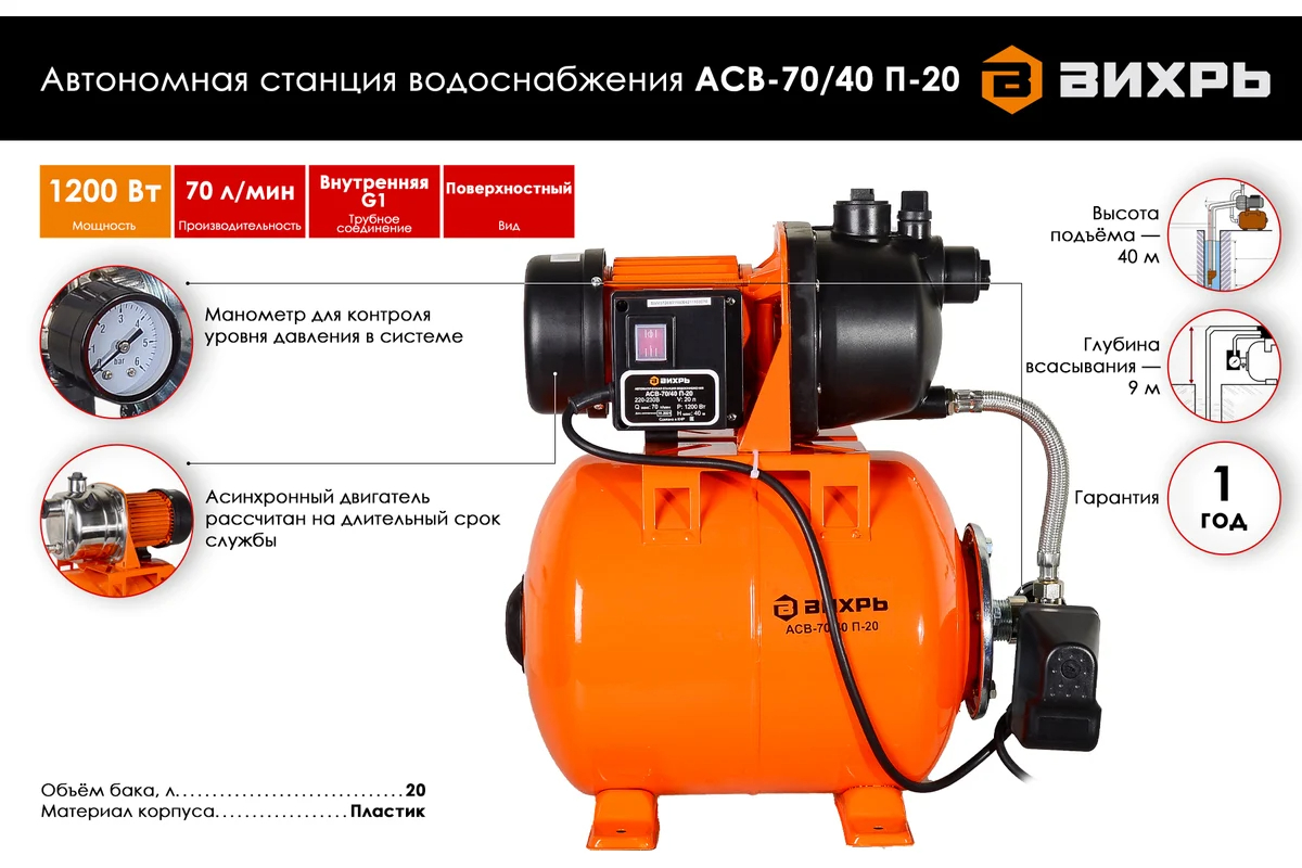 Автономная станция водоснабжения Вихрь АСВ-70/40 П-20 [68/1/16] — это удобное и надёжное решение для обеспечения постоянного доступа к воде в коттеджах, загородных домах и других объектах, где требуется независимый источник водоснабжения. Благодаря насосу мощностью 1200 Вт станция создаёт напор до 40 м, гарантируя подачу воды даже на большие расстояния или высоту.