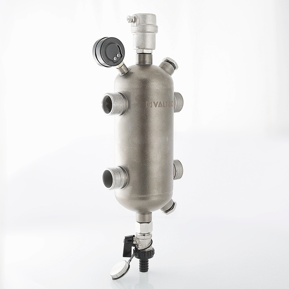 Конструкторы VALTEC дополнили гидрострелку спиральным сепаратором, интенсифицирующим отделение воздуха из теплоносителя, а также разделительной перегородкой, снижающей теплопотери из-за конвекции рабочей среды. Оба элемента выполнены перфорированными, из нержавеющей стали.