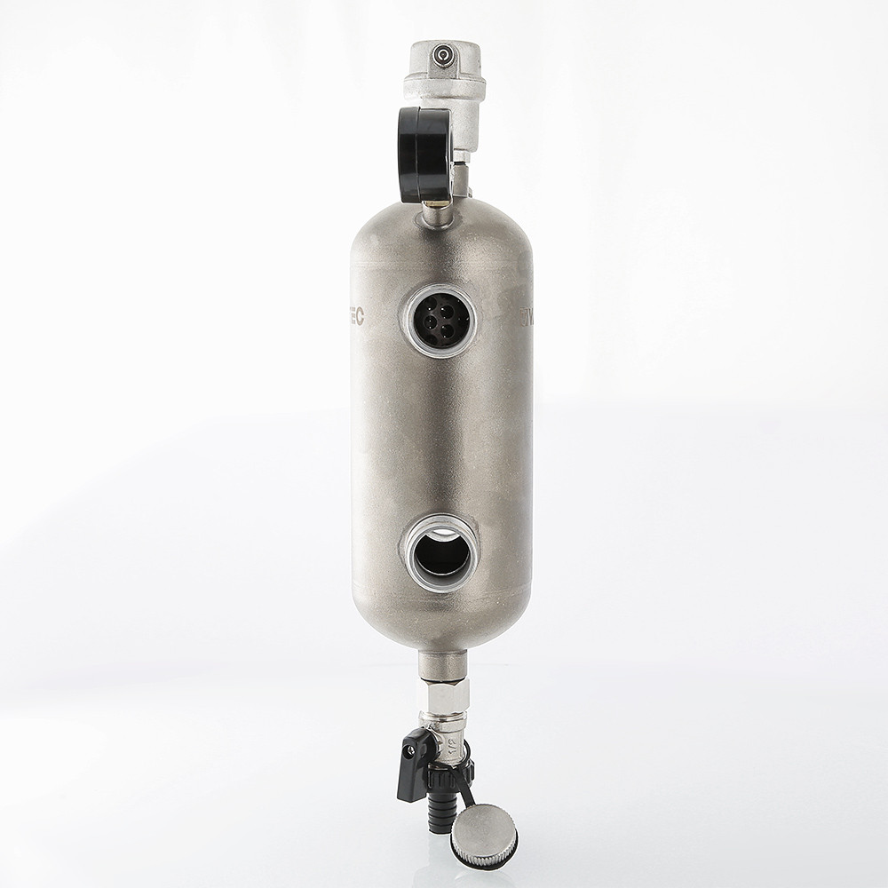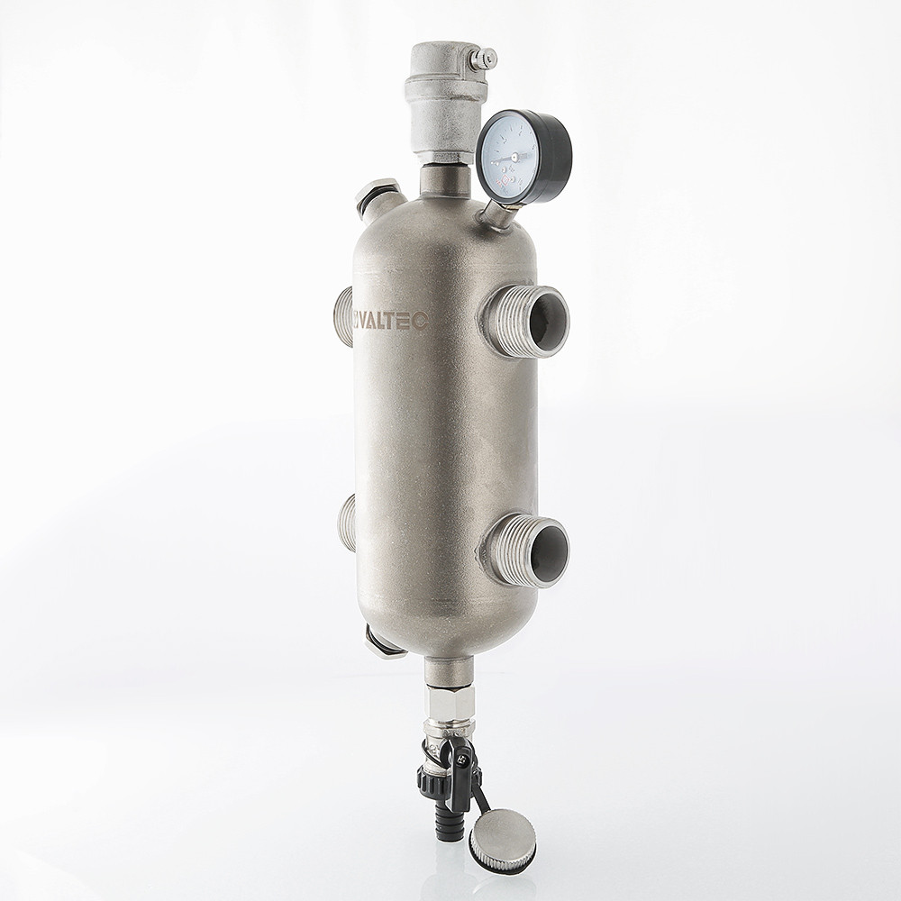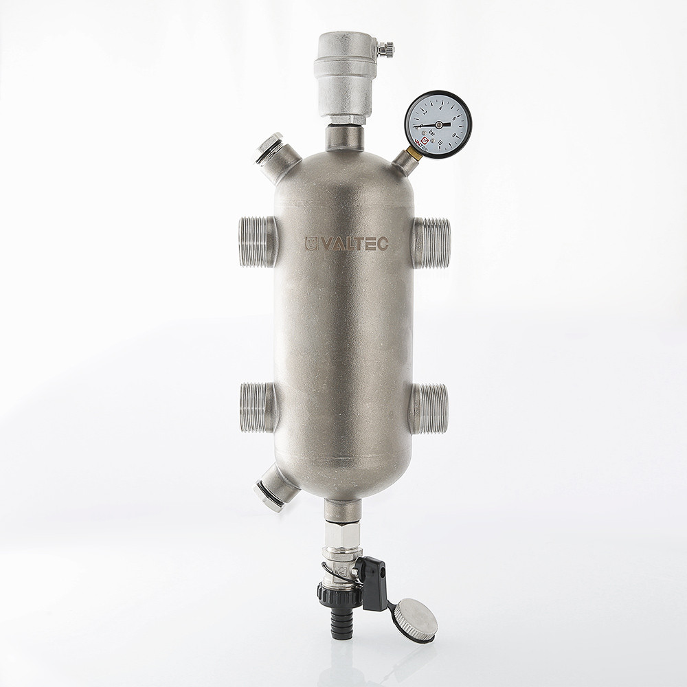 Гидравлическая стрелка из нержавеющей стали комплектуется манометром, дренажным клапаном, автоматическим воздухоотводчиком с отсекающим клапаном. На корпусе предусмотрены резьбовые патрубки для дополнительной установки датчика температуры, термометра, магнитного шламоуловителя. Патрубки заглушены резьбовыми пробками.