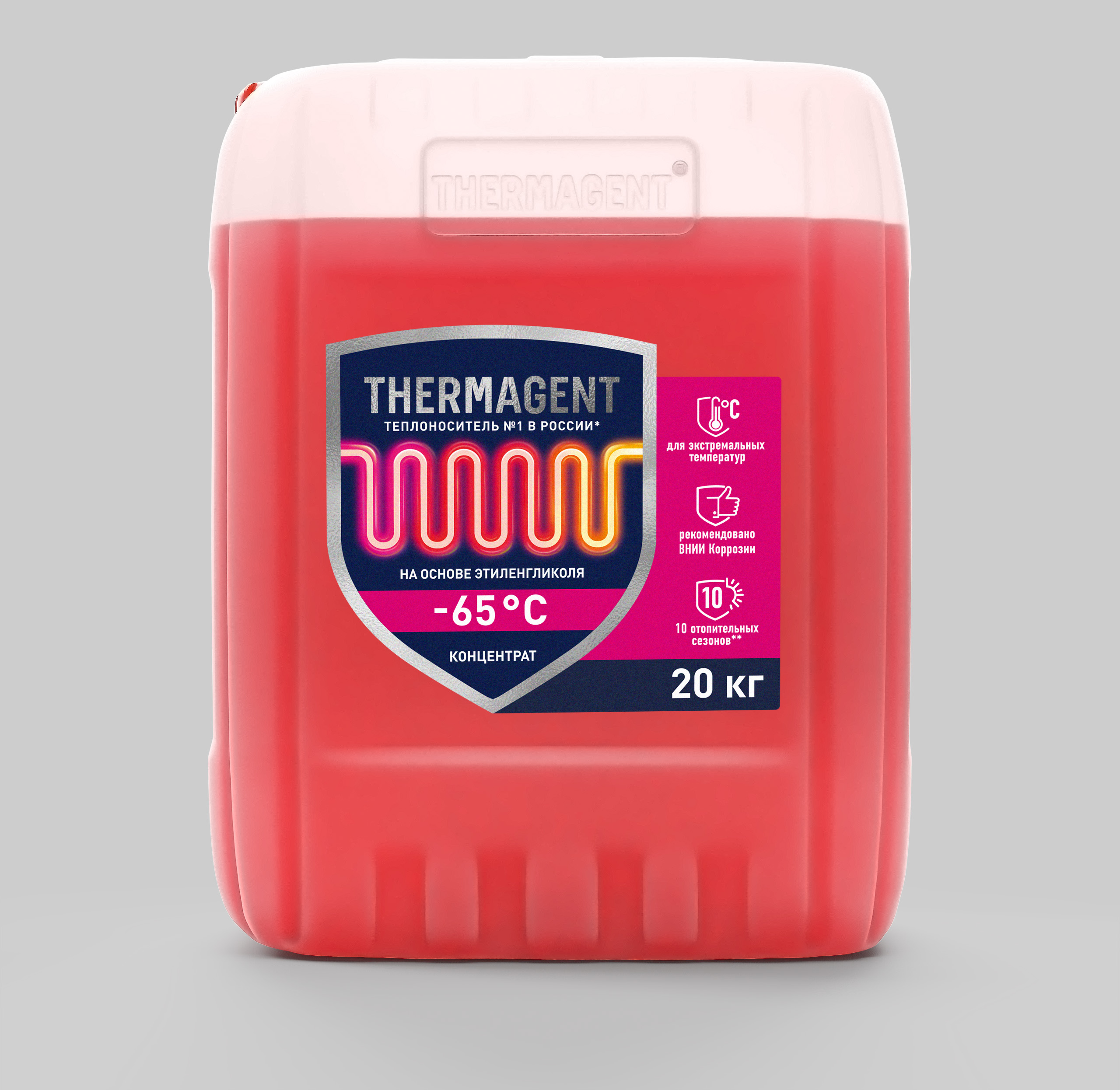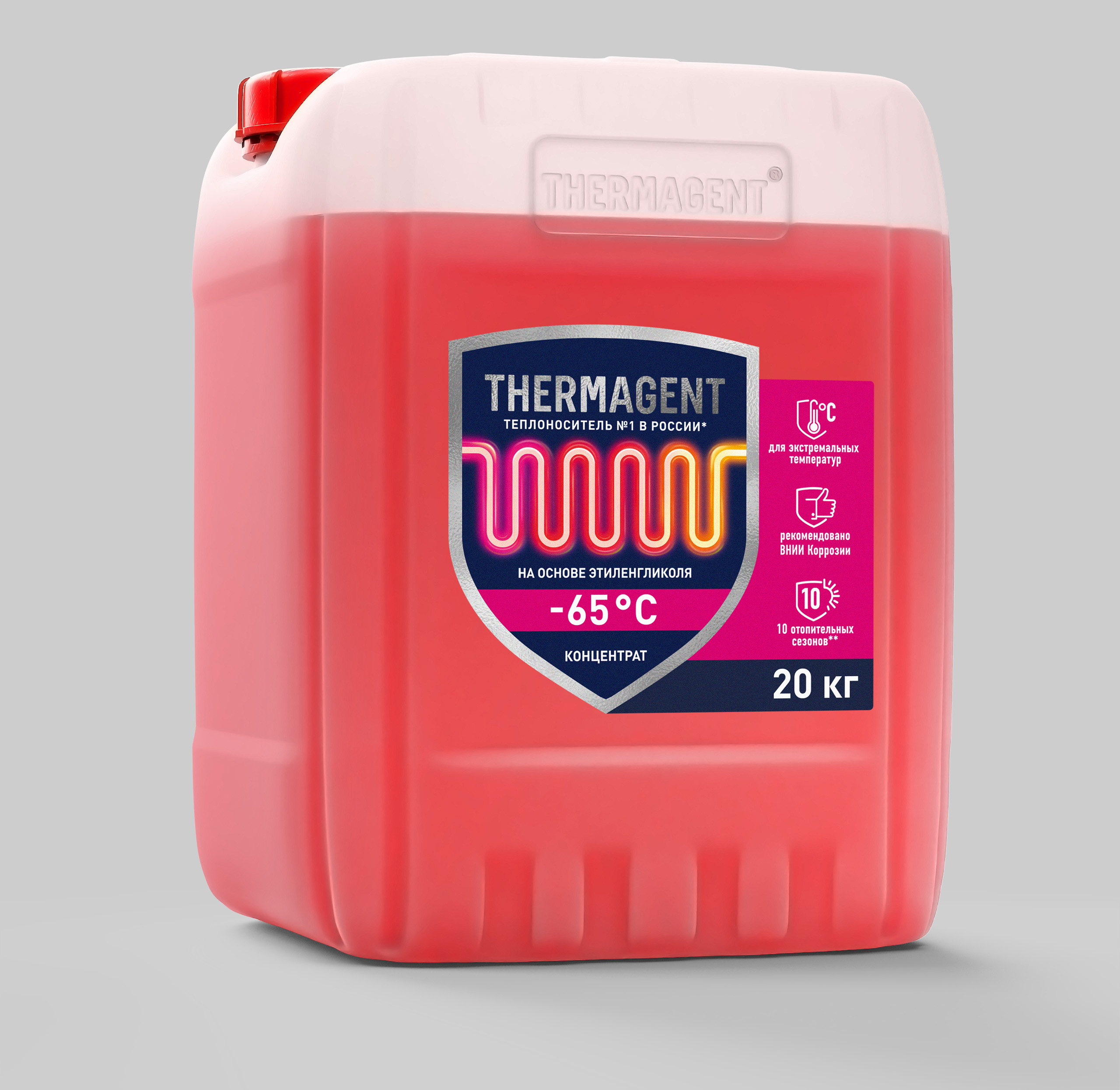 «THERMAGENT -65» — теплоноситель на основе высококачественного очищенного этиленгликоля. Предназначен для использования в качестве рабочей жидкости в закрытых системах отопления, вентиляции и кондиционирования для жилых и производственных зданий, систем охлаждения производственного оборудования, чиллеров, холодильных агрегатов и т.д. Подходит для работы в тяжелых климатических условиях, Температура начала кристаллизации составляет -65 °С. В состав добавлены присадки, придающие теплоносителю антикоррозионные, антивспенивающие и антибактериальные свойства. Теплоноситель имеет увеличенный срок службы* (до 10 отопительных сезонов).