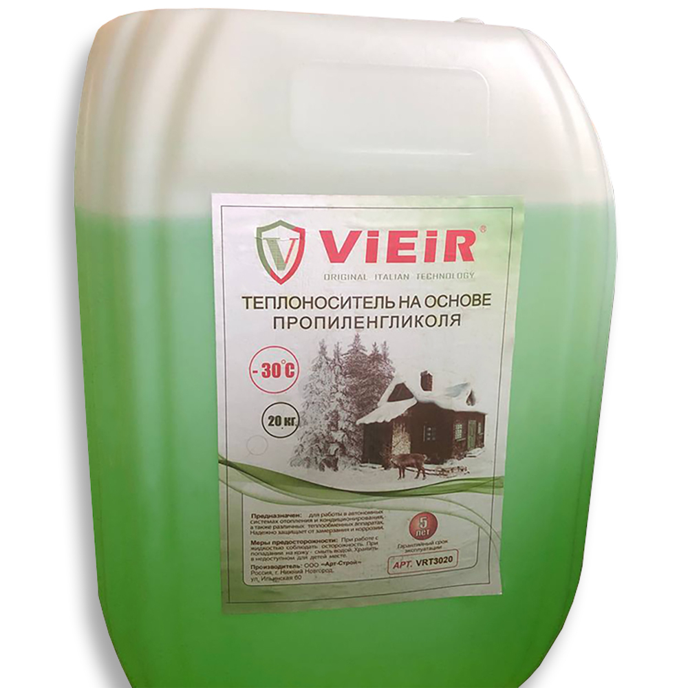 Теплоноситель для отопления ViEiR, пропиленгликоль -30 (20 кг) зеленый. Теплоноситель ViEiR на основе пропиленгликоля обеспечивает безопасное использование в отопительных системах благодаря отсутствию ядовитых соединений и испарений. Отлично подходит даже для открытых систем отопления.