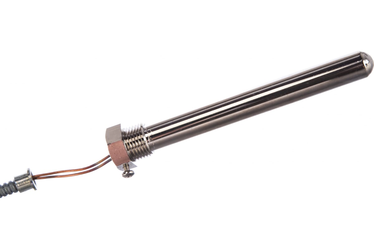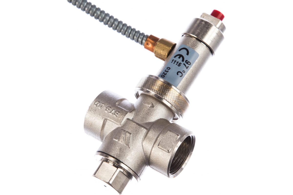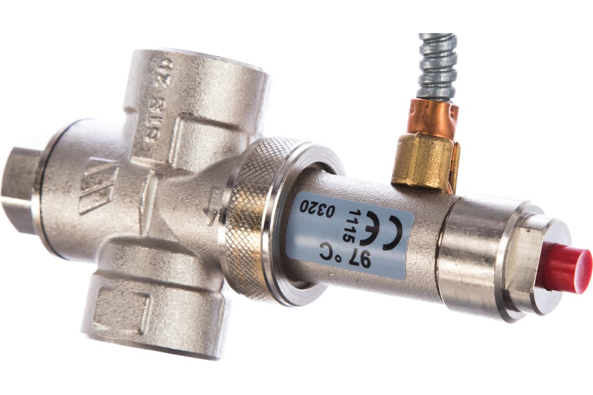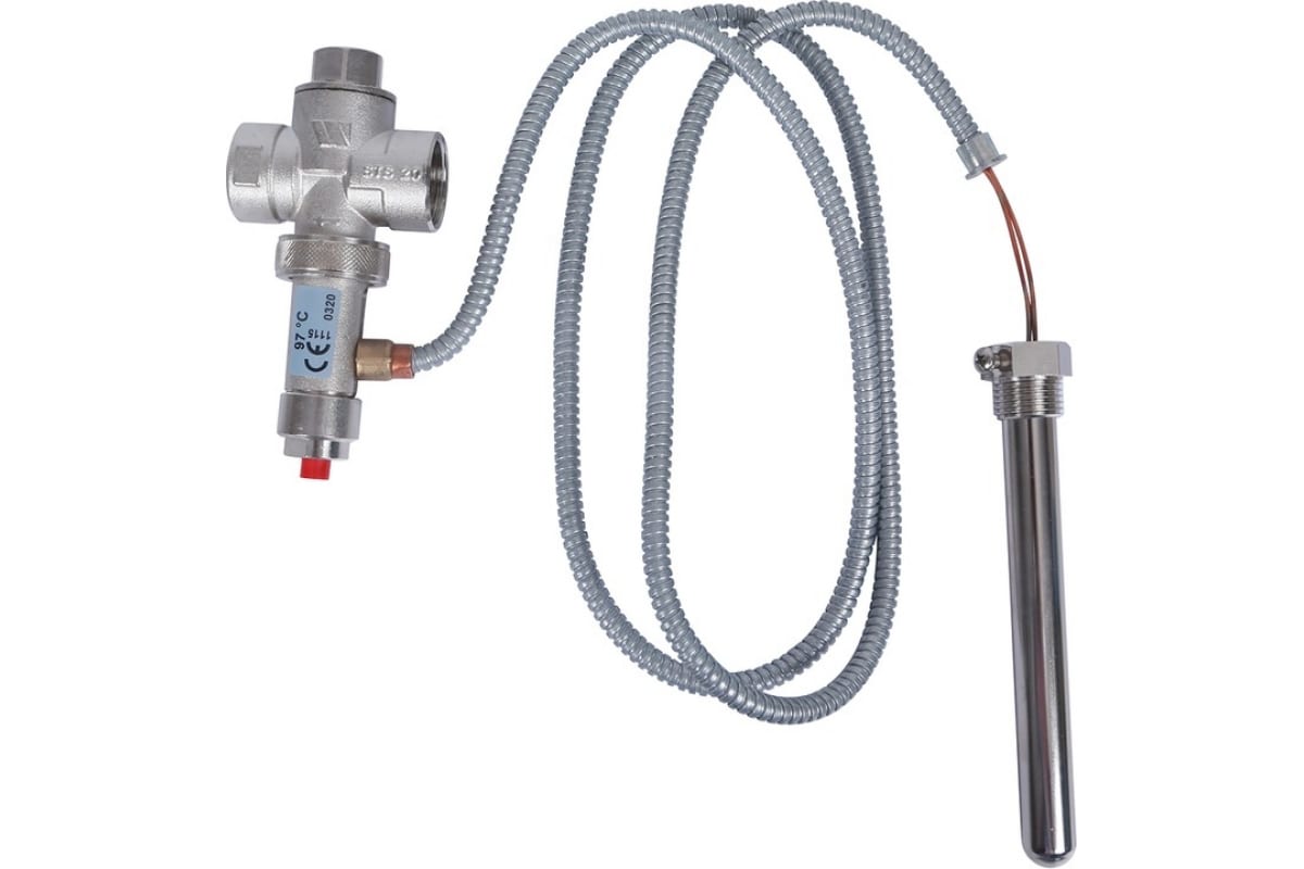 Термоклапан STOUT для твердотопливных котлов 1/2"", капиляр 1300 мм, работающих на твердом, нераспылённом топливе. Погружаемая в котел гильза с двумя термодатчиками, длина 145 мм, наружная резьба 1/2"", температура срабатывания 97 °С. Максимальный расход при открытом клапане 6500 л/ч при давлении 8 бар. Максимальная температура в режиме протока (при открытом клапане) 107 °С.