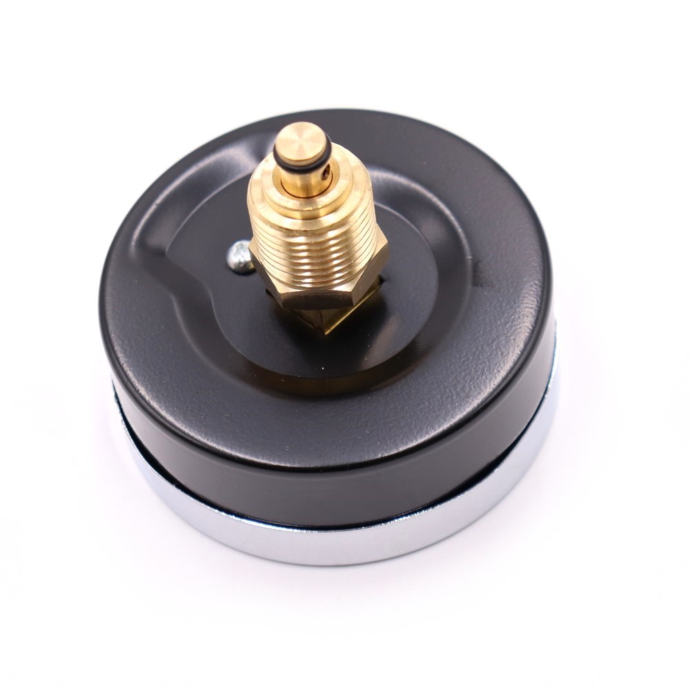 Термоманометр имеет верхнее соединение из латуни с резьбой 1/2". Корпус изготовлен из металла устойчивого к коррозии и окрашен высококачественной эмалью черного цвета для дополнительной защиты от коррозии.