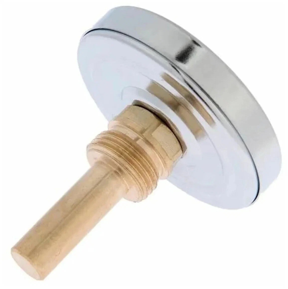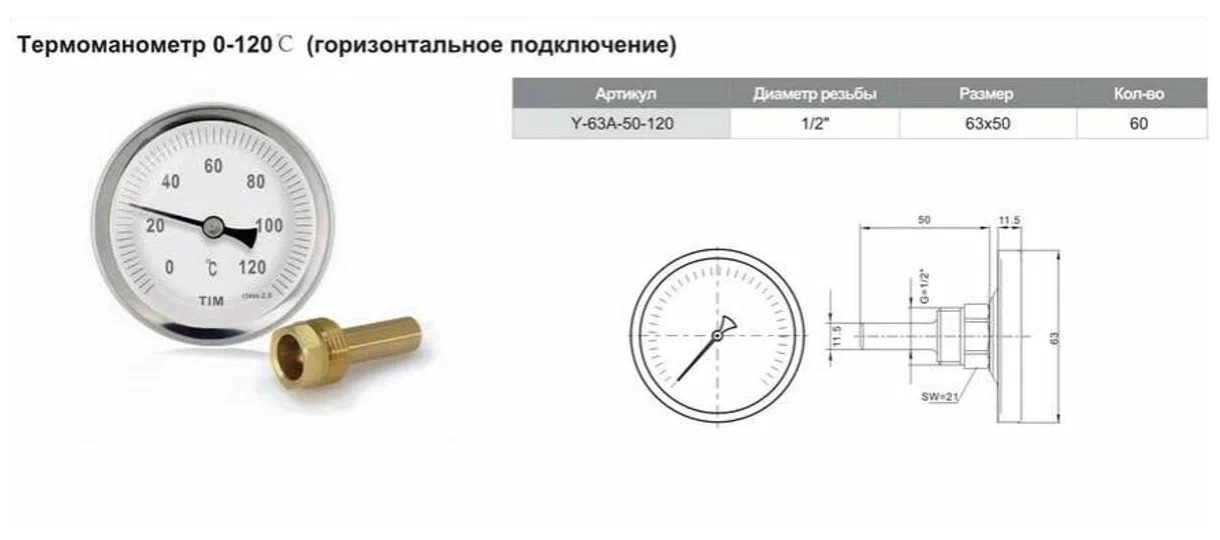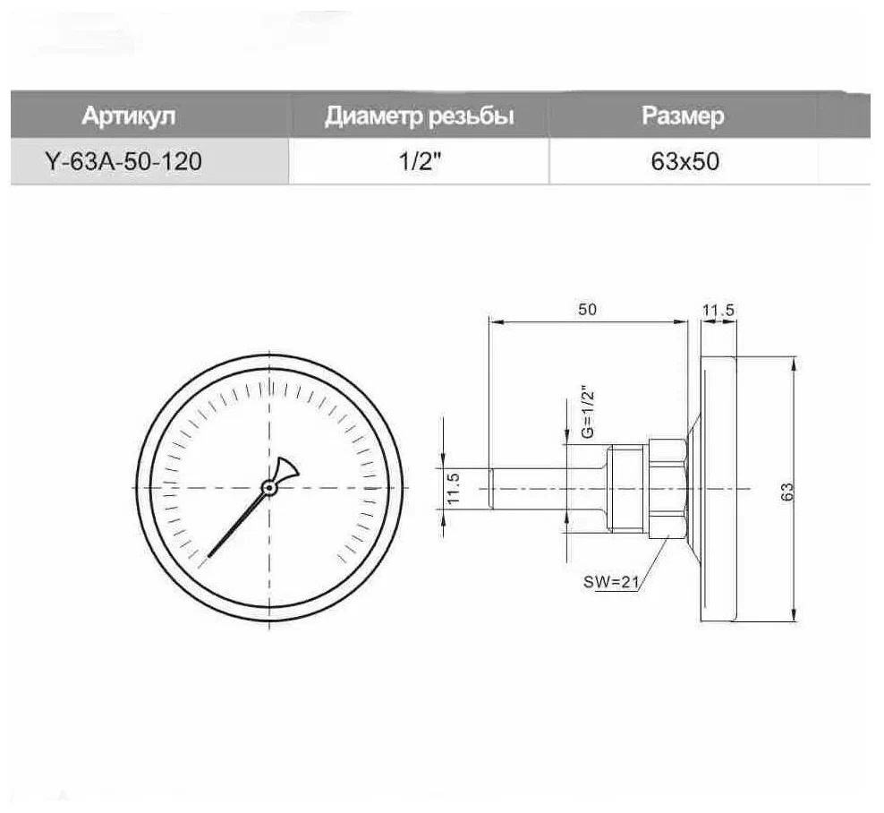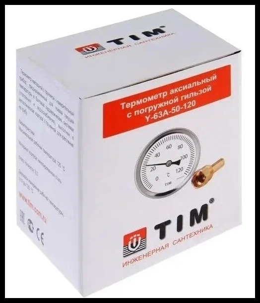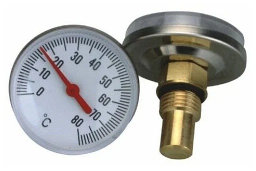 Термометр для систем отопления. Биметаллический термометр с гильзой имеет погружную гильзу с внешней резьбой 1/2"" и диаметр корпуса 63 мм и предназначен для измерения температуры до 120 С. Установка таких термометров осуществляется следующим образом: гильза закручивается в соответствующее отверстие диаметром 1/2"", а сам прибор свободно вставляется в нее. характеристики: Тип - аксиальный Присоединительный размер 1/2"" НР Максимальная рабочая температура 120 °C Диаметр корпуса: 63мм Длина гильзы: 50мм Материал корпуса: металл, пластик Прибор не подлежит обязательной сертификации.