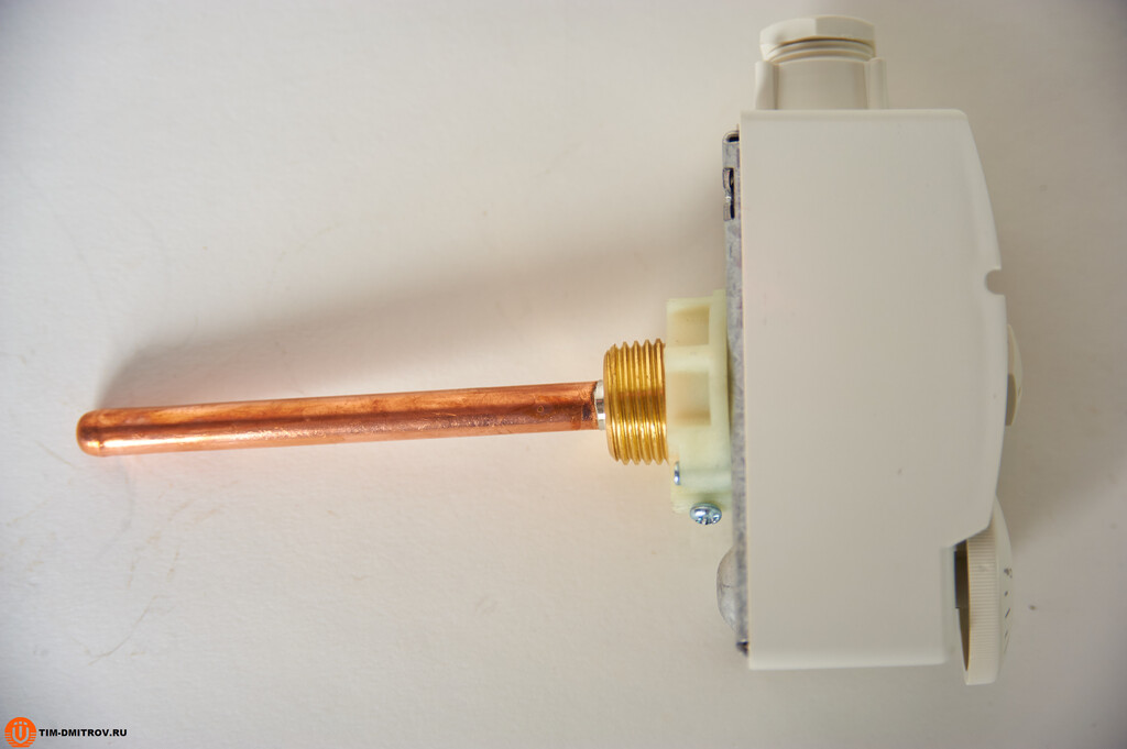 Погружной термостат, с переключающимися контактами, предназначен для регулирования температуры труб систем радиаторного отопления , теплого пола, горячего водоснабжения и др. Принцип работы основан на свойстве объемного температурного расширения. В медной погружной гильзе находится термочувствительный баллон. Жидкость, находящаяся в баллоне термостата, нагревается, расширяется и через капиллярную трубку избыточный объем переходит в сильфон. Сильфон удлиняется и передает усилие на контактную группу. Таким образом, осуществляется автоматическое поддержание заданной температуры в системе.