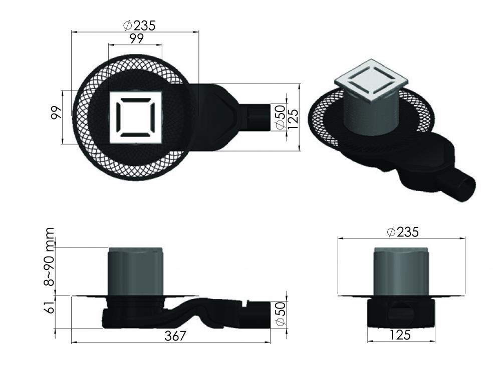 вертикальный выпуск D50/105 H50, пропускная способность 48л/мин, монтаж 360°