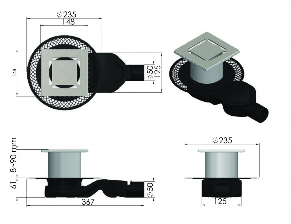 горизонтальный выпуск D50 H60, пропускная способность 42л/мин, монтаж 360°