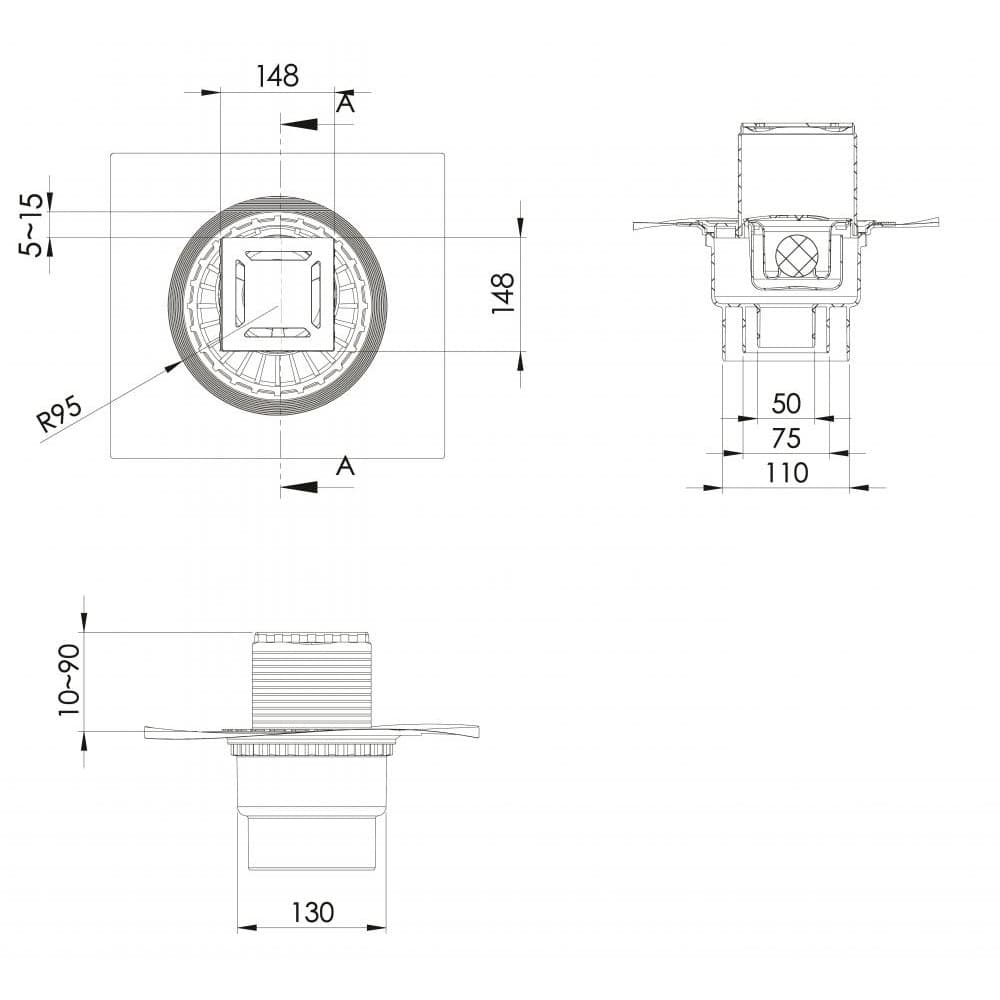 Трап Berges водосток Zentrum Norma 150х150, хром глянец, выпуск D50/75/110 H74 вертикальный (091463)
