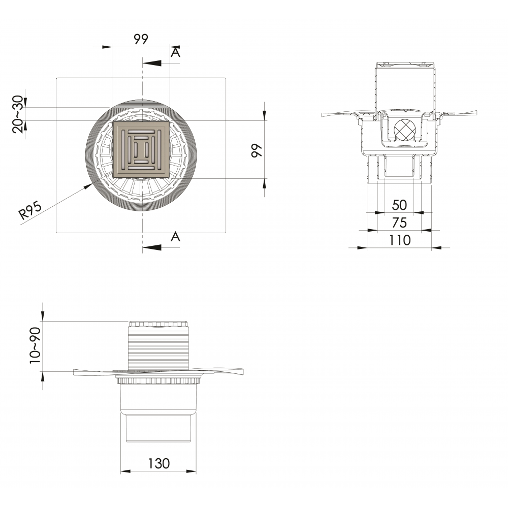 Трап Berges водосток Zentrum Uno 100х100, матовый хром, выпуск D50/75/110 H74 вертикальный (090471)