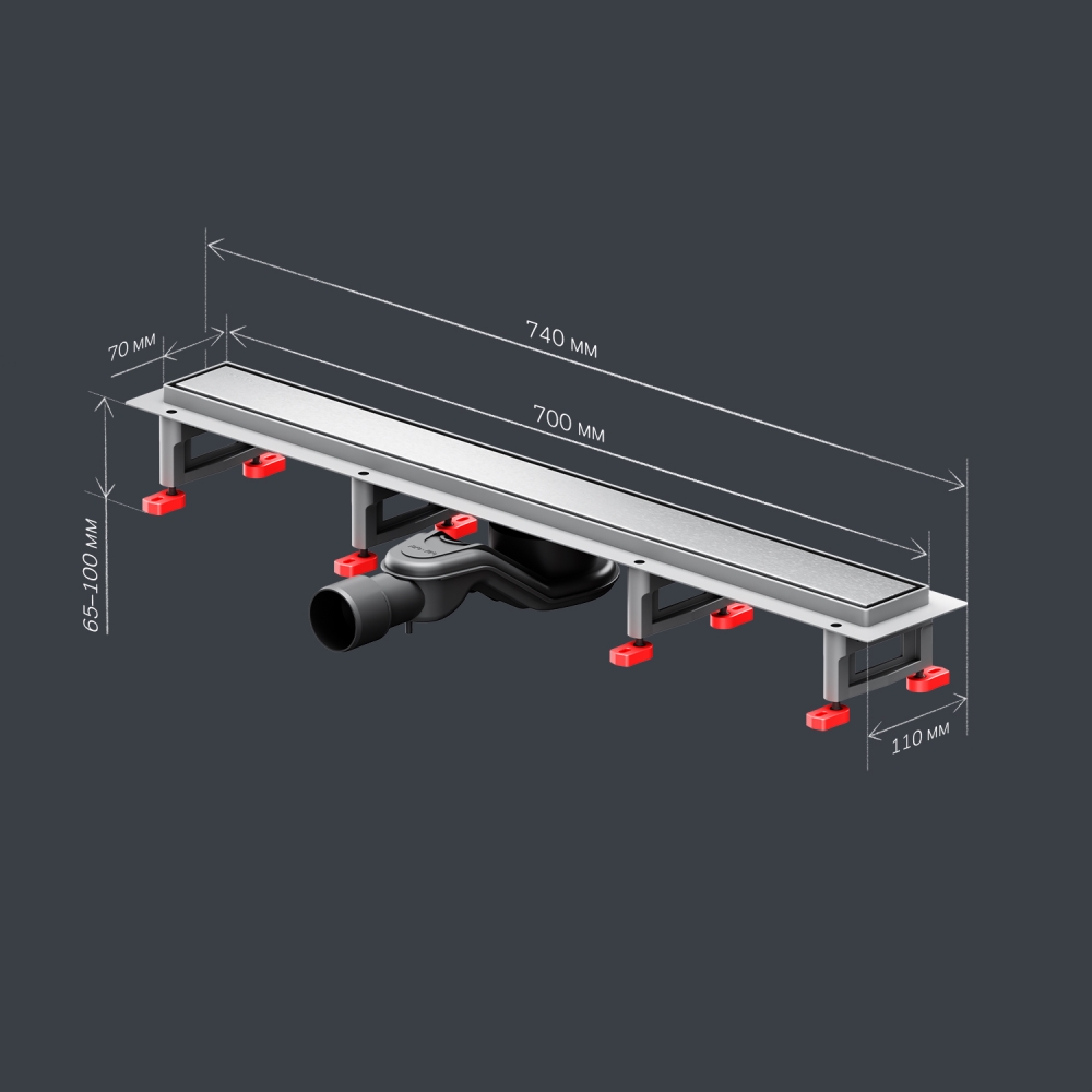 Продукт обладает низкой высотой монтажа и возможностью регулировки что предполагает экономию бюджета при заливке пола. Нержавеющая сталь со специальным антикоррозийным защитным покрытием нанесенная методом кислотной пассивации. Выход разработан на два диаметра: 40 и 50 мм которые выбираются в процессе монтажа.