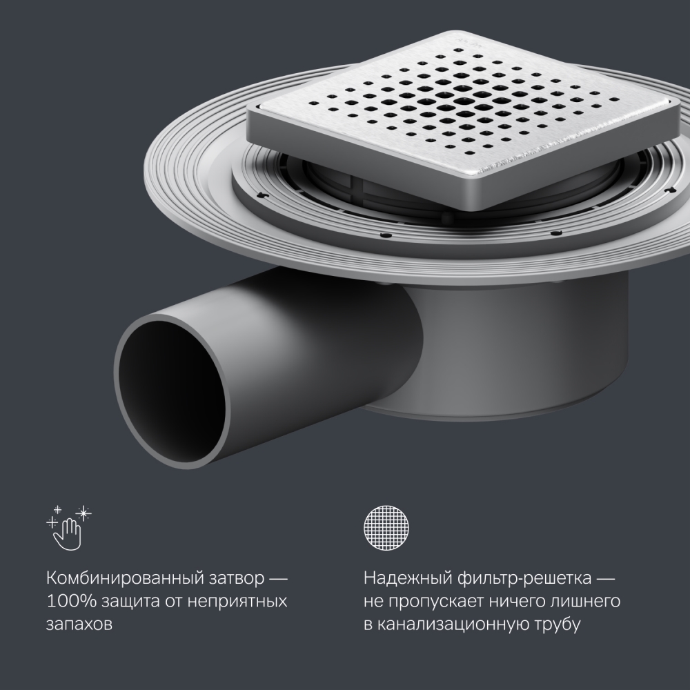 Обладает надежным комбинированным затвором. Максимальное предотвращение проникновения запахов из канализации. Широкий фланец трапа позволяет надежно установить и закрепить изделие в напольной поверхности что помогает предотвратить риск протечек и повреждений изделия. Продукт обладает возможностью регулировки высоты монтажа что предполагает экономию бюджета при заливке пола.