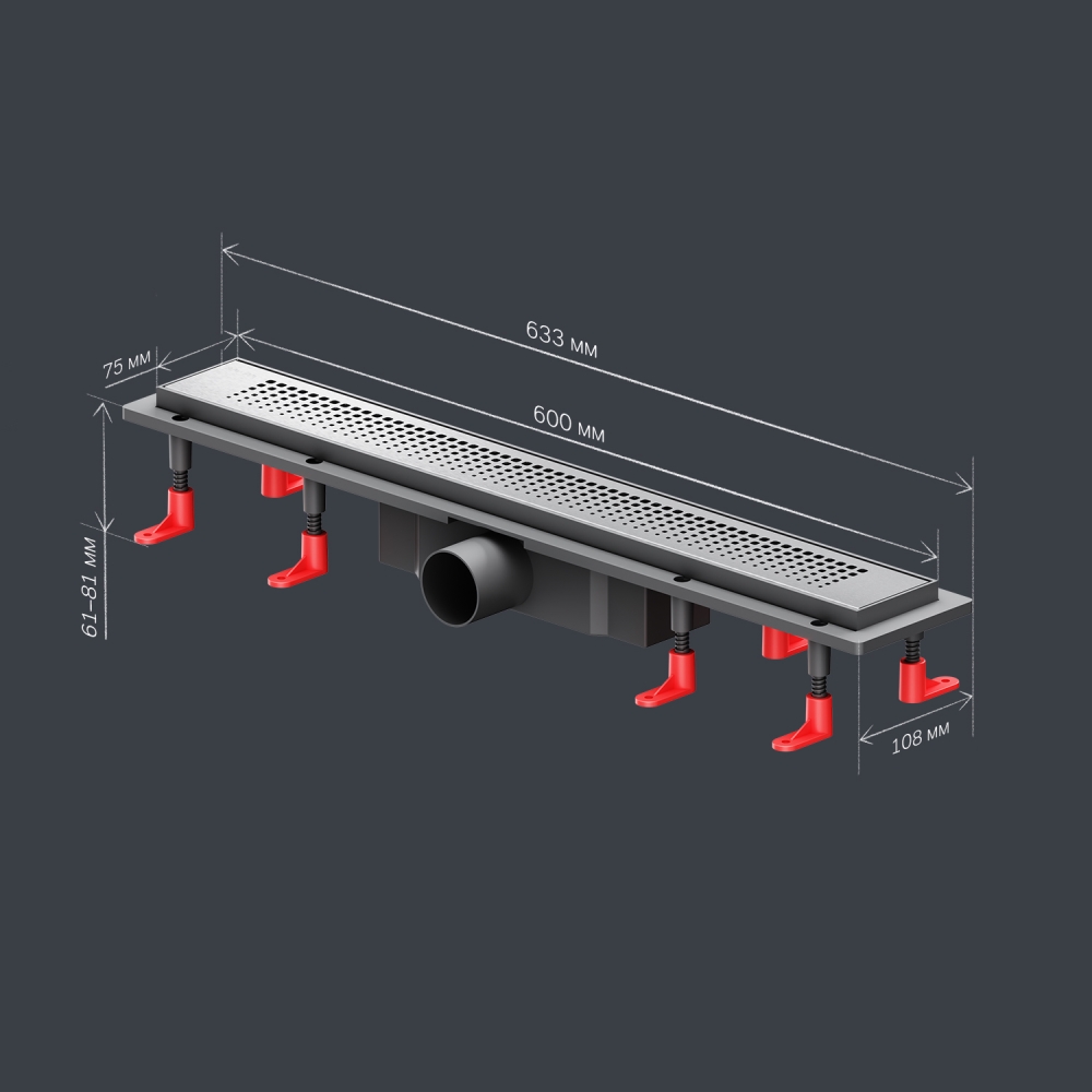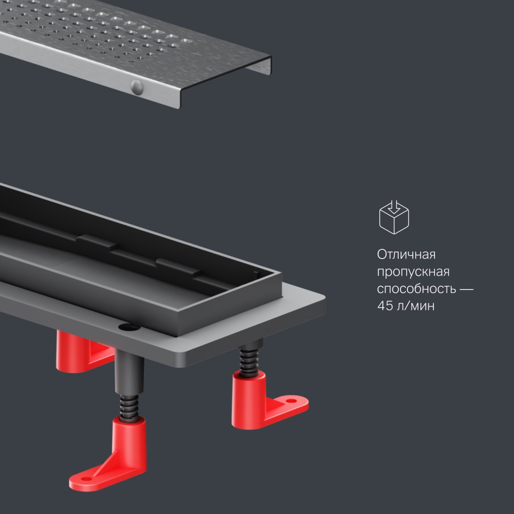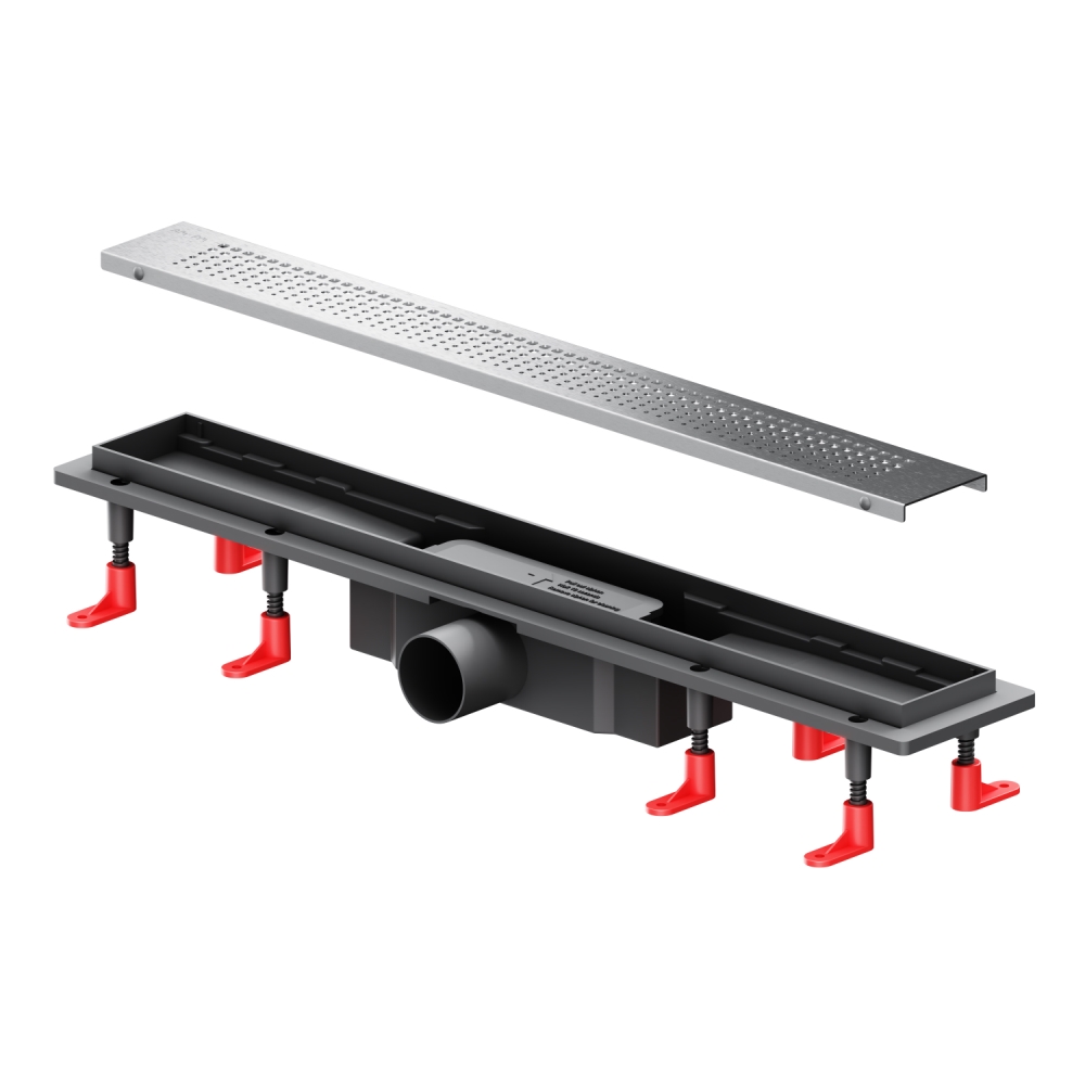 Продукт обладает низкой высотой монтажа и возможностью регулировки что предполагает экономию бюджета при заливке пола. Трап имеет инновационную конструкцию решетки с фильтром что значительно увеличивает межсервисный интервал.
