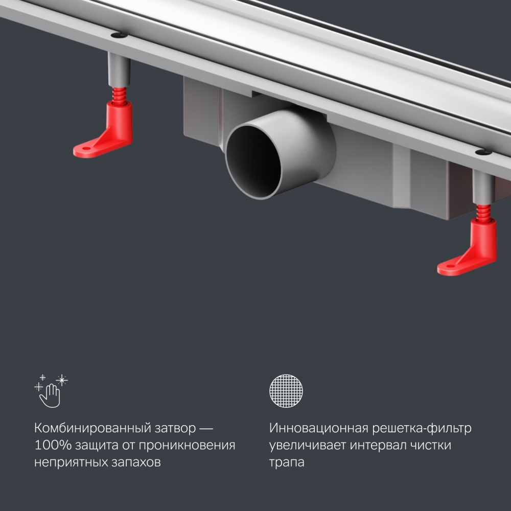 Продукт обладает низкой высотой монтажа и возможностью регулировки что предполагает экономию бюджета при заливке пола. Трап имеет инновационную конструкцию решетки с фильтром что значительно увеличивает межсервисный интервал.