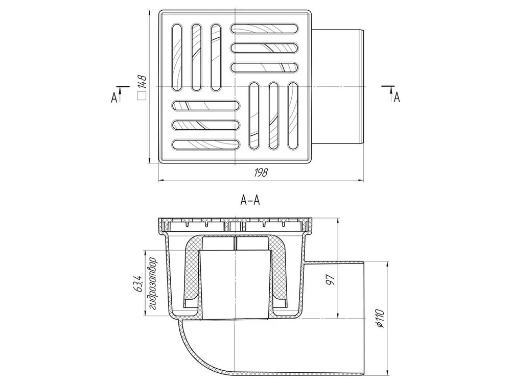 Трап горизонтальный 110 мм. (150*150) АНИ нерегулируемый, с гидрозатвором (решетка пластик) АНИ пласт (TA1110)