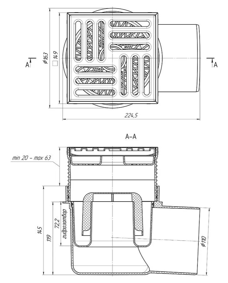 • Тип решетки слива: сталь, 150 на 150 мм