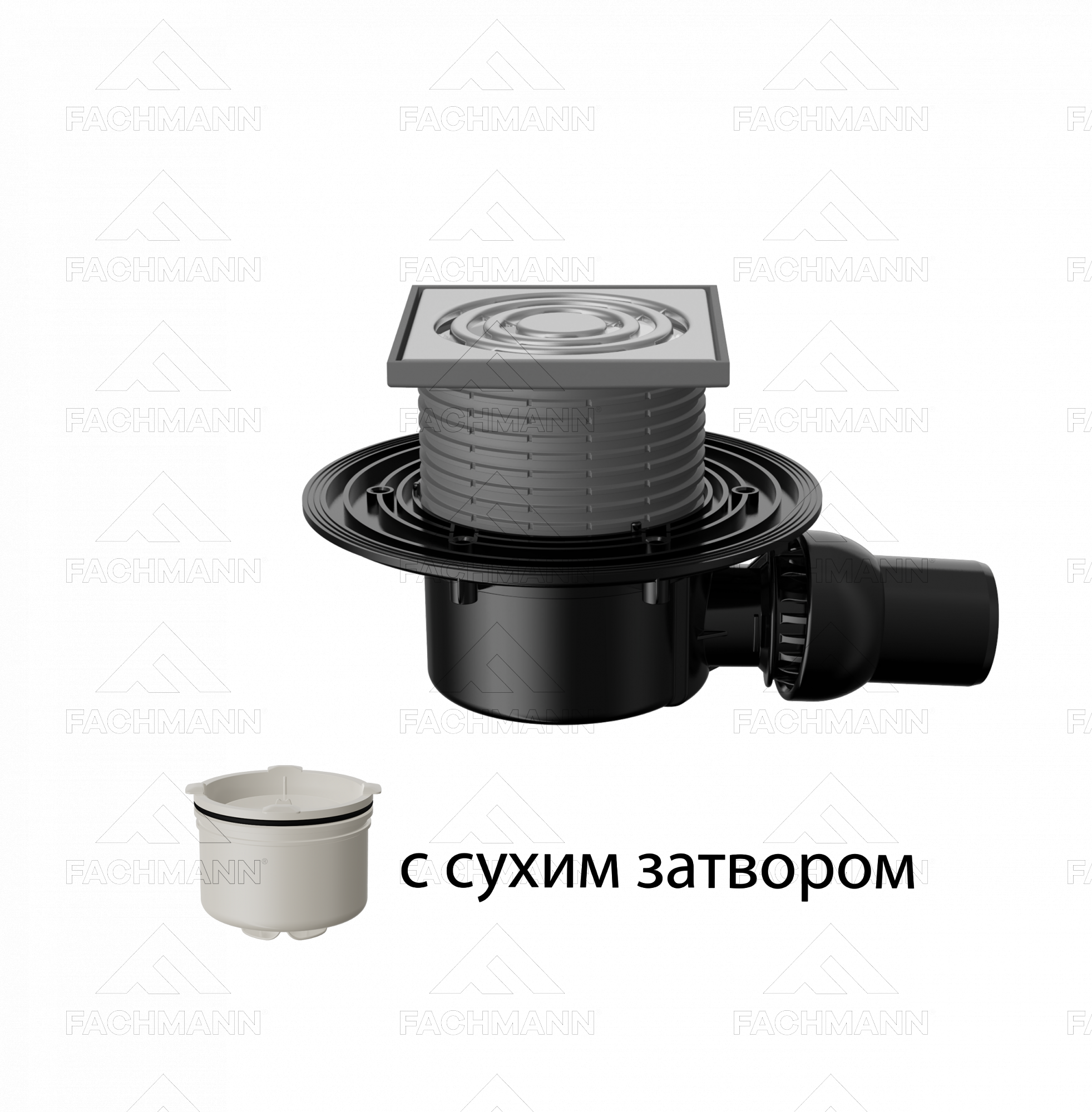 Трап регулируемый Fachmann T 520.0 SDsP 122x122 горизонтальный шарнирный выпуск DN50 с "сухим" гидрозатвором, решетка нерж. сталь, пластиковый подрамн