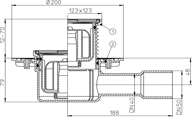 Трап с решеткой из нержавеющей стали 115*115 мм в пластиковом подрамнике 123*123 мм, с сухим сифоном "Primus", с пропускной способностью - 0,5 л/с, с горизонтальным выпуском диаметром - DN 40/50 мм.