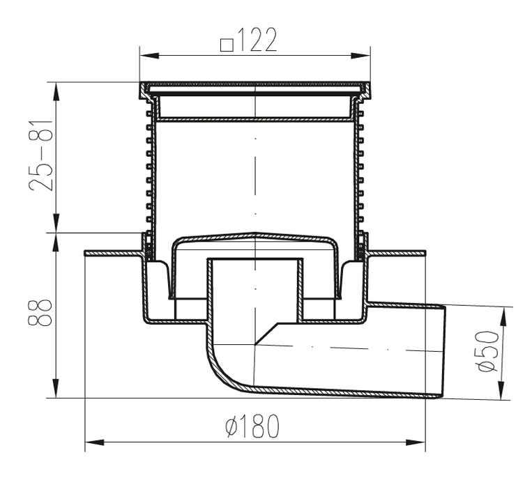 Трап MCH для пола с боковым сливом D50 решетка нерж. 150х150 c воротником нептун