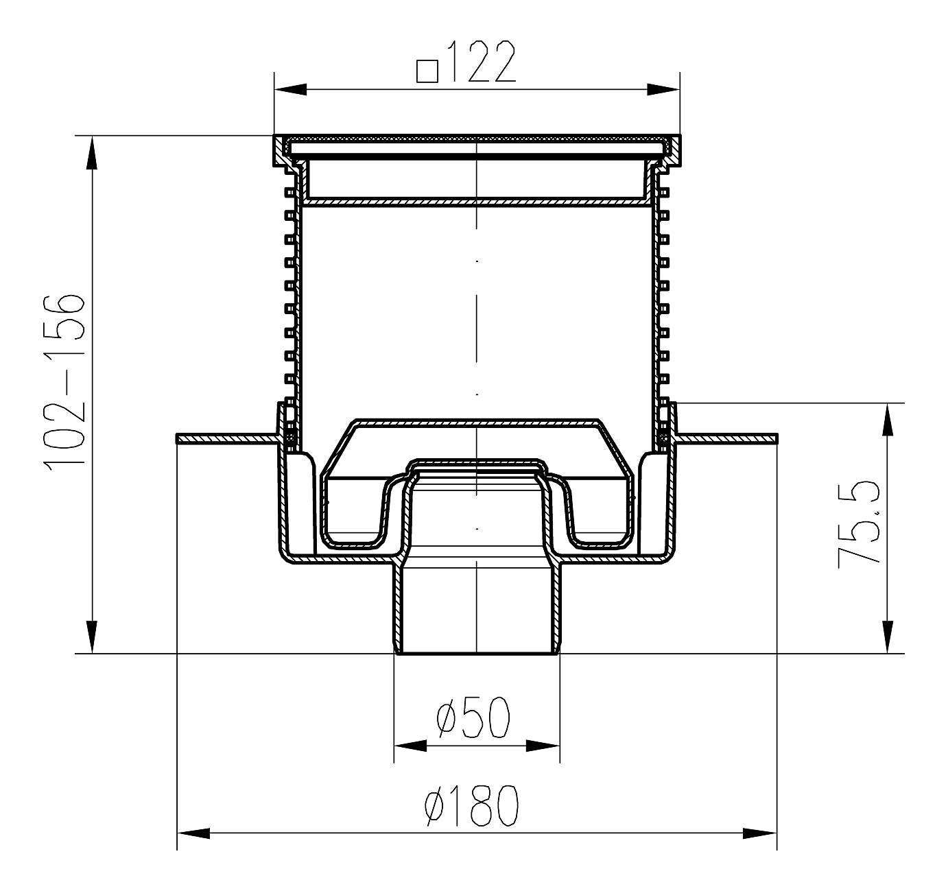 Трап MCH для пола с нижним сливом D50 решетка и рамка нерж. 122х122 c воротником нептун