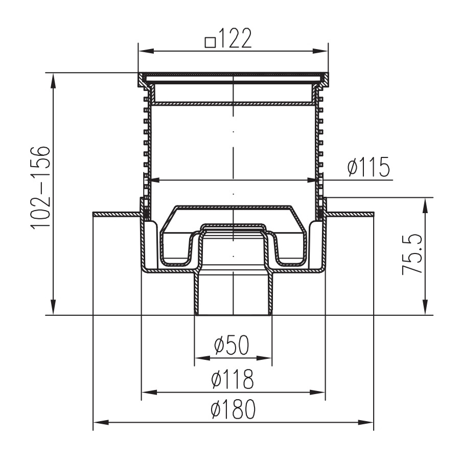 Трап MCH для пола с нижним сливом D50 решетка под плитку 100х100х13 рамка нерж. 122х122 c воротником нептун
