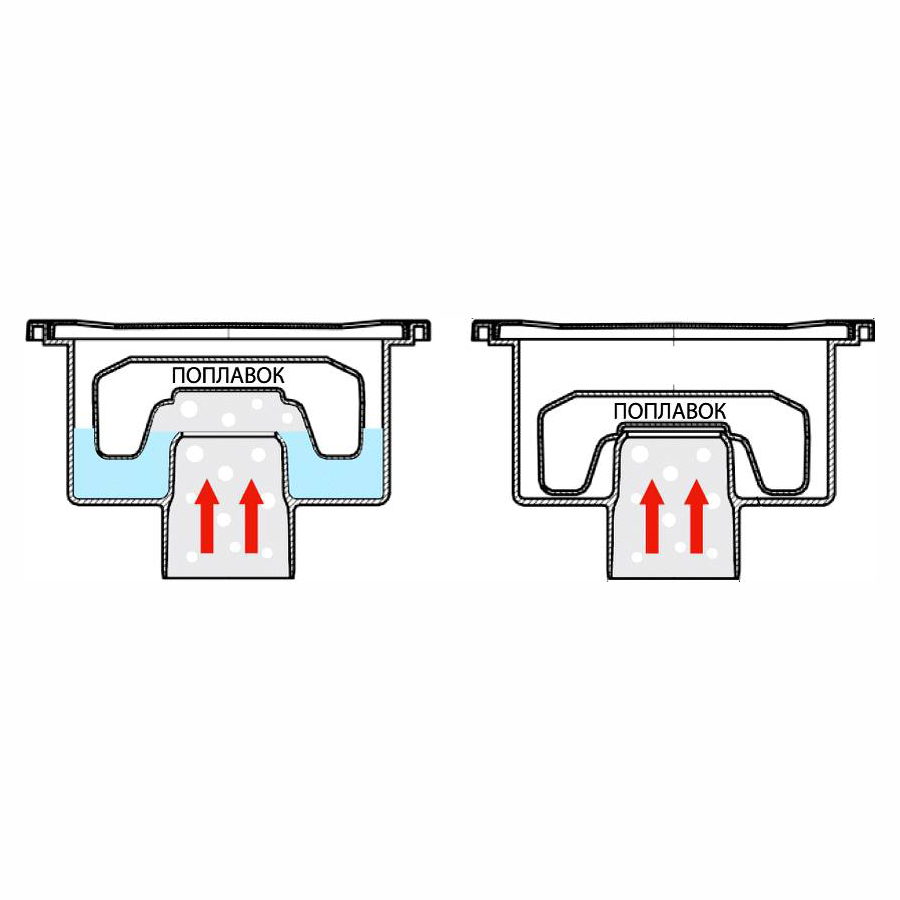 При снижении уровня воды в гидрозатворе или ее полном высыхании поплавок закроет отверстие сифона и тем самым воспрепятствует проникновению запаха в помещение. Изготовлен из полипропилена, акрилонитрилбутадиенстирола и нержавеющей стали DIN 1.4301. Нагрузка К3 - 300 кг, термостойкость до 70°C, стандарт EN 1253.