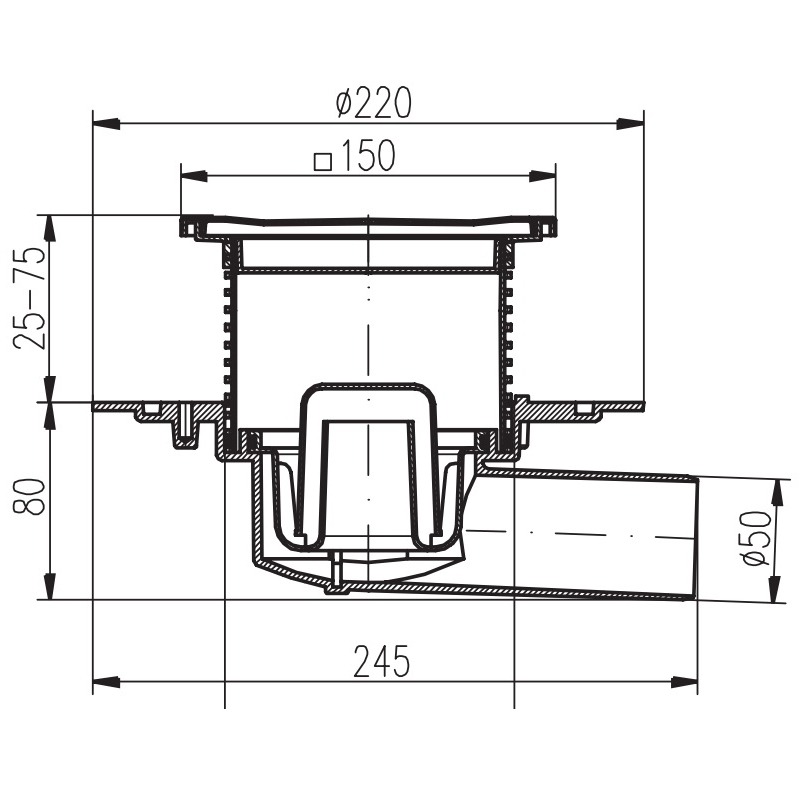 Трап MCH с боковым сливом универсальный DN50 решетка под плитку 120х120, рамка нерж. 150х150 (г/з+с/з)