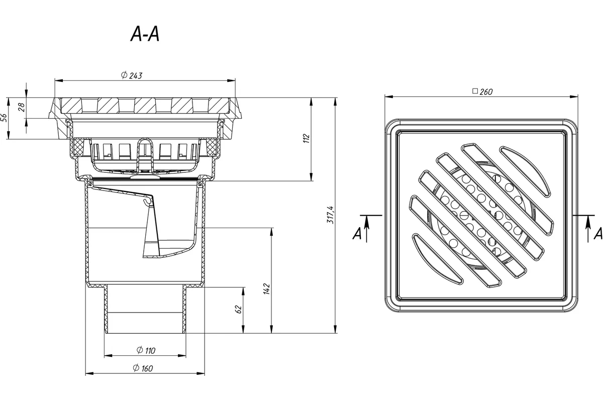 Трап нерегулируемый Fachmann Т 606 PNsG 260x260 вертикальный выпуск DN 110/160 с корзинкой и незамерзающим гидрозатвором, решетка чугунная, чугунный п
