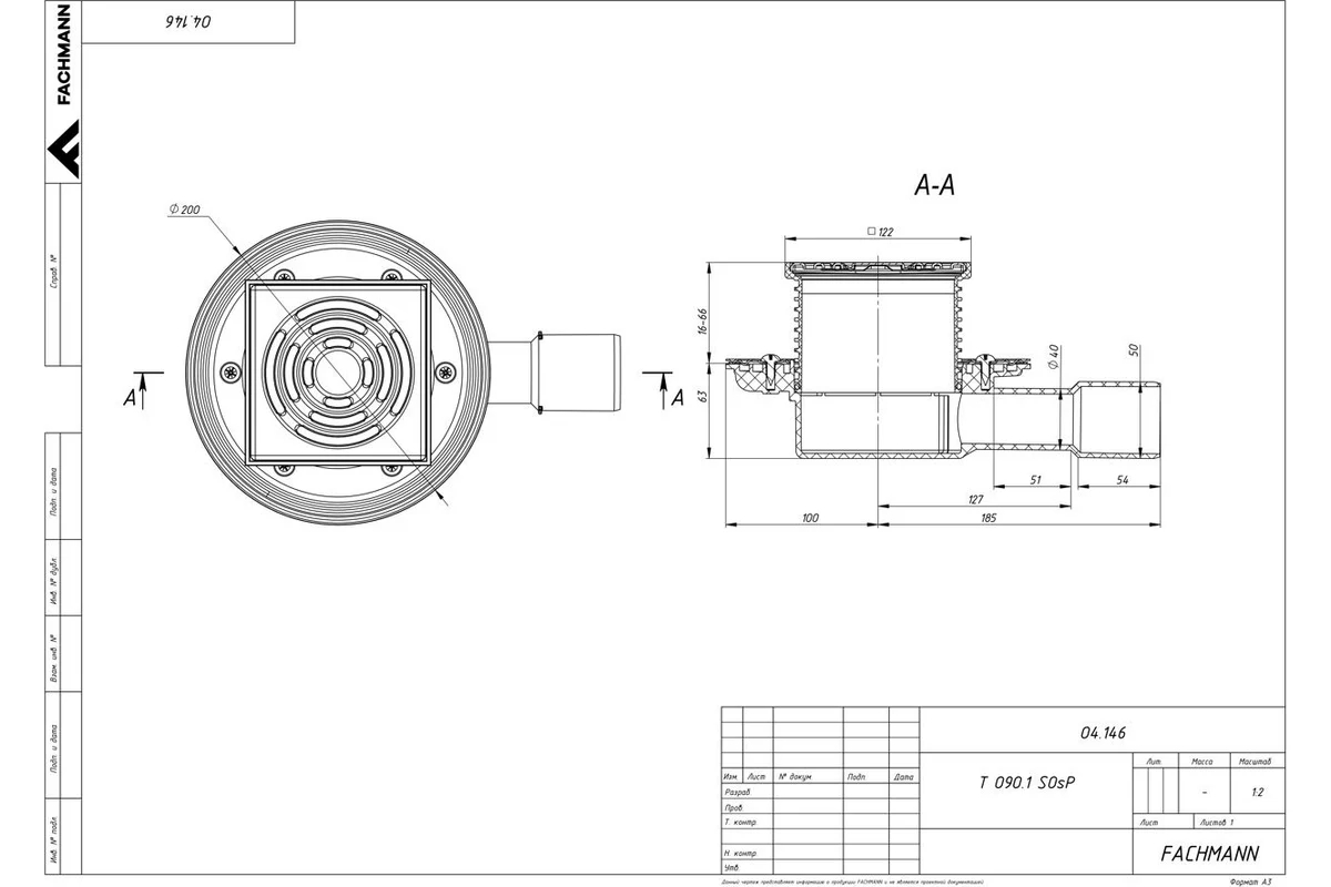 Трап регулируемый Fachmann T 090.1 SOsP 122x122 горизонтальный выпуск DN40/50 без гидрозатвора, решетка нерж. сталь, пластиковый подрамник (04.146)