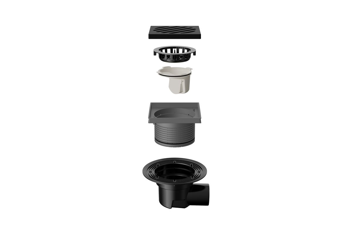 Трап регулируемый Fachmann T 615.0 PNsP 241x241 горизонтальный выпуск DN 110 с корзинкой и незамерзающим гидрозатвором, без прижимного фланца, решетка