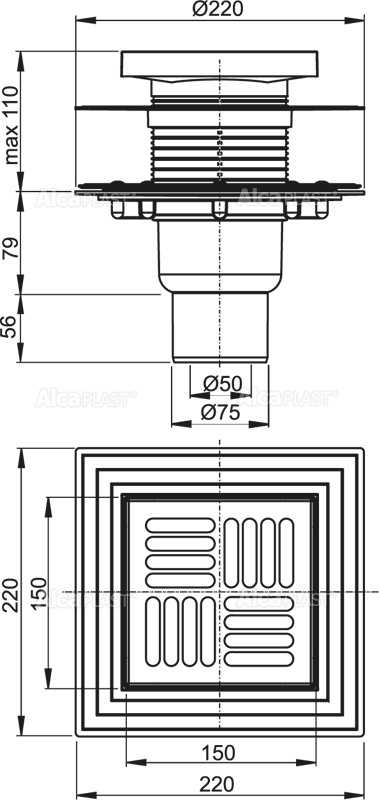 Трап сливной AlcaPlast 150х150/50/75 мм (прямой подвод, нерж. решетка, сухой/гидрозатвор) (APV4444)