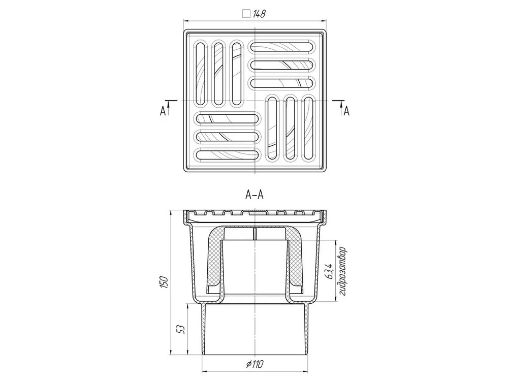 Трап вертикальный 110 мм. (150*150) АНИ нерегулируемый, с гидрозатвором (решетка нерж.ст.) АНИ пласт (TA1212)
