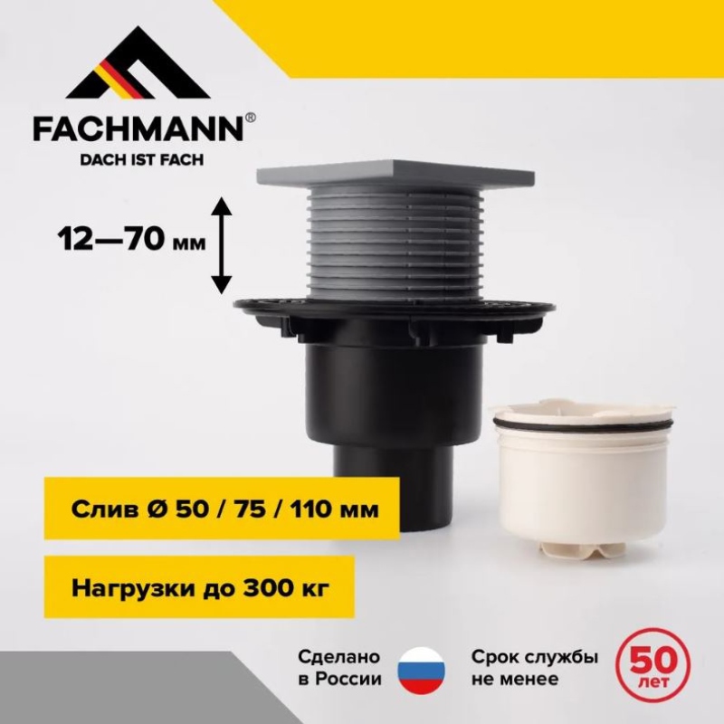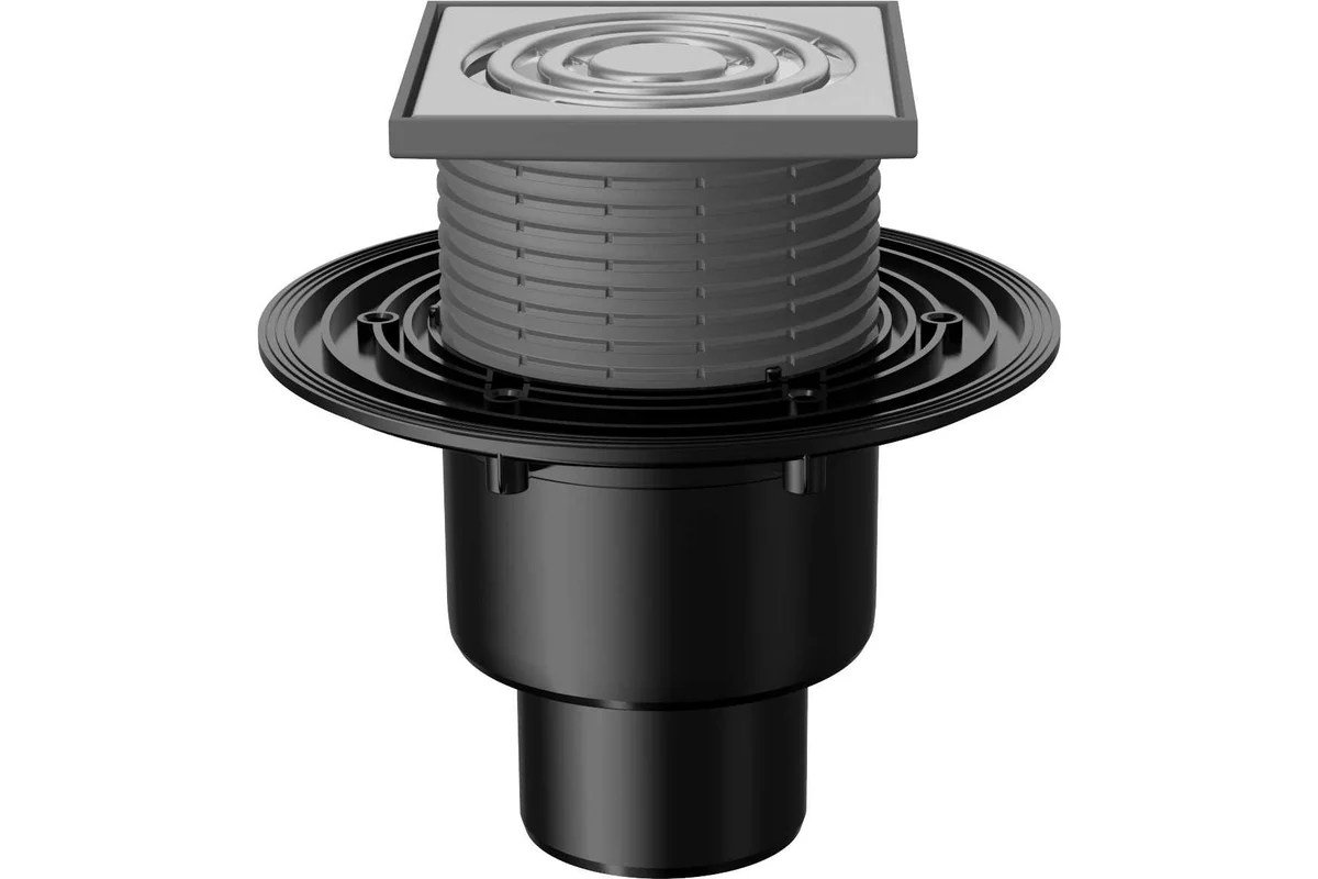 Трап регулируемый Fachmann T 310.0 SDsP 122x122 вертикальный выпуск DN50/75/110 с "сухим" гидрозатвором, решетка нерж. сталь, пластиковый подрамник, б