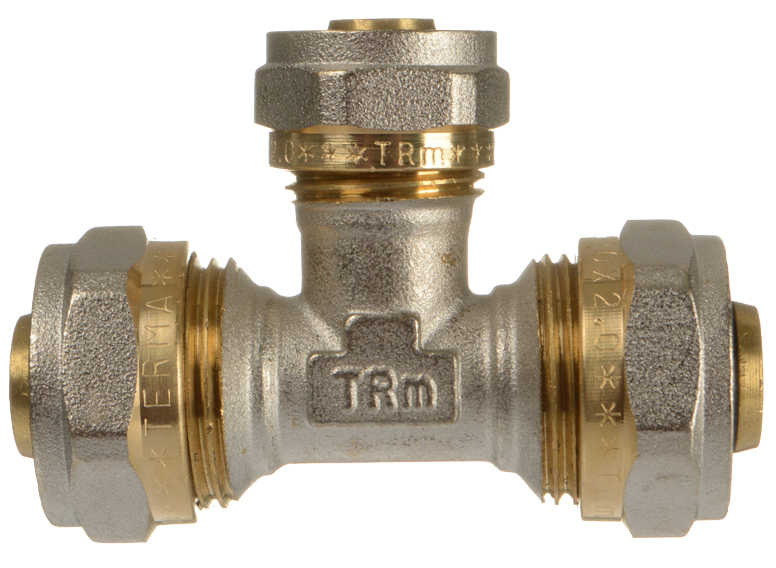 Тройник латунный никелированный 20*16*20 цанга/цанга/цанга ТeRma 01568 предназначен для создания разъемных соединений в системах металлопластиковых трубопроводов. Температура рабочей среды до +95°C, нормативное давление 25 бар.