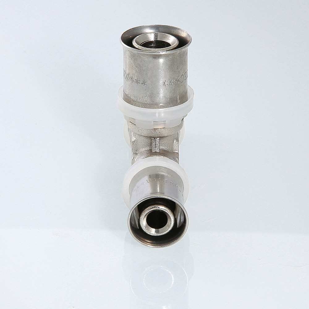 Пресс-фитинг – тройник предназначен для соединения трех труб – металлопластиковых, из сшитого полиэтилена или полиэтилена повышенной термостойкости. Корпус выполнен из сантехнической латуни марки CW617N, уплотнительные кольца штуцеров – из EPDM плотностью 1,22 г/см3, пресс-гильзы – из нержавеющей стали. Нейлоновая обойма выполняет функции фиксатора гильзы, направляющей для пресс-насадок и диэлектрической прокладки, прерывающей контакт между алюминием трубы и латунью корпуса. Конструкция пресс-фитингов VALTEC обеспечивает повышенную пропускную способность, надежность соединений, прочность и термостойкость. Монтаж фитинга производится пресс-инструментом с насадкой «ТН». Типоряд содержит равнопроходные и переходные пресс-тройники.