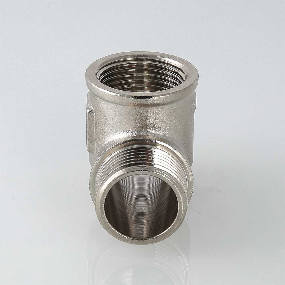 Резьбовой фитинг – тройник с переходом на наружную резьбу изготовлен из латуни марки CW617N методом горячего штампования с последующим нанесением никелевого гальванопокрытия. Применяется для создания разъемных резьбовых соединений на трубопроводах из стальных, медных, латунных, пластиковых и металлопластиковых труб. Резьба – трубная цилиндрическая по ГОСТу 6357 (ISO 228, EN 10226), наружная/внутренняя/внутренняя. Допускается соединение внутренней резьбы с наружной конической трубной по ГОСТу 6211 (ISO R7). Наружная резьба фитинга имеет насечки для эффективного удержания уплотнительного материала.