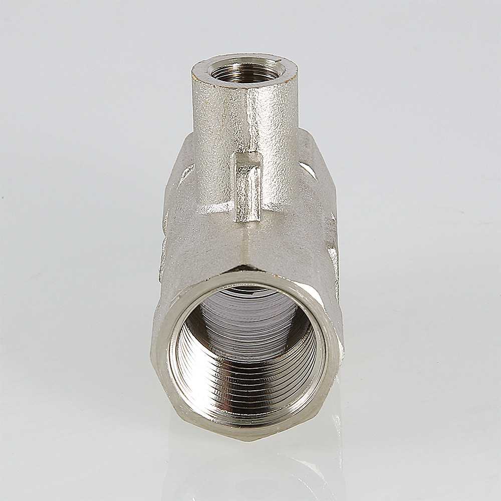Фитинг выполнен горячим штампованием из сантехнической латуни марки CW617N, имеет никелевое покрытие. Предусмотрено ушко для пломбирования.