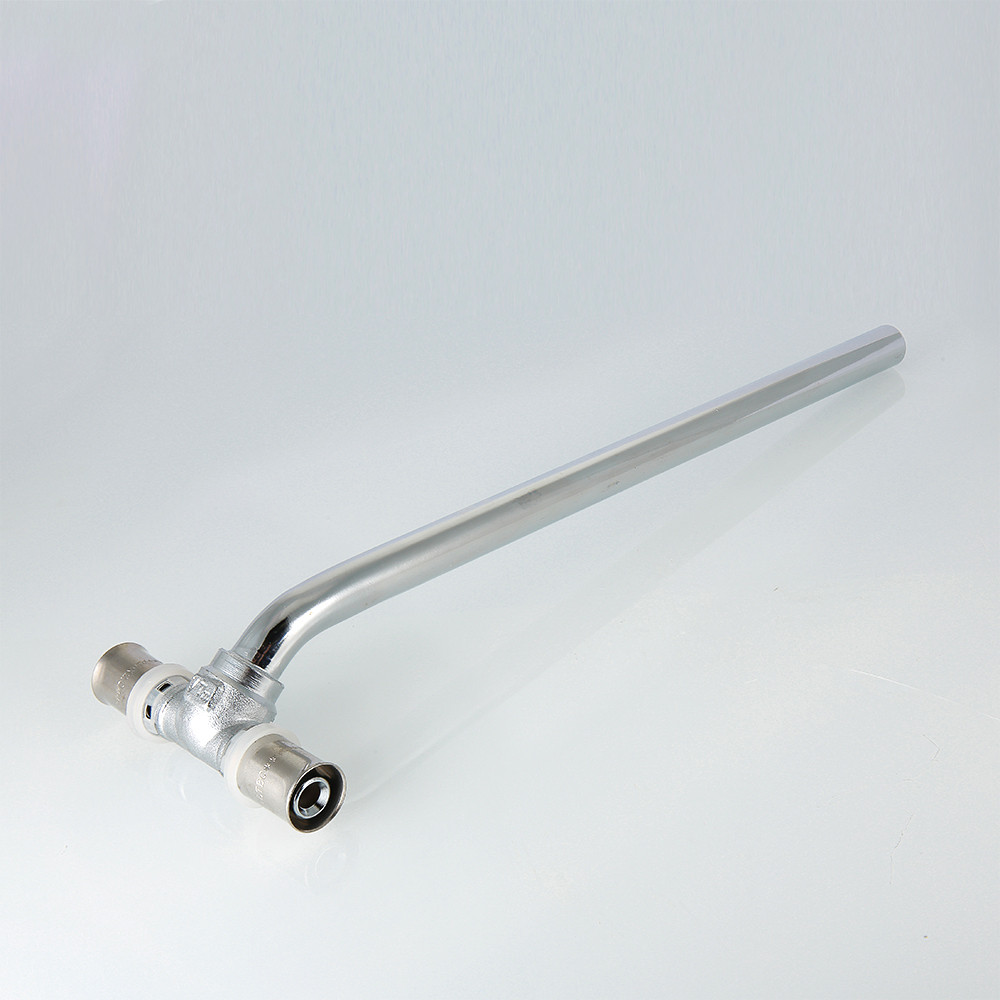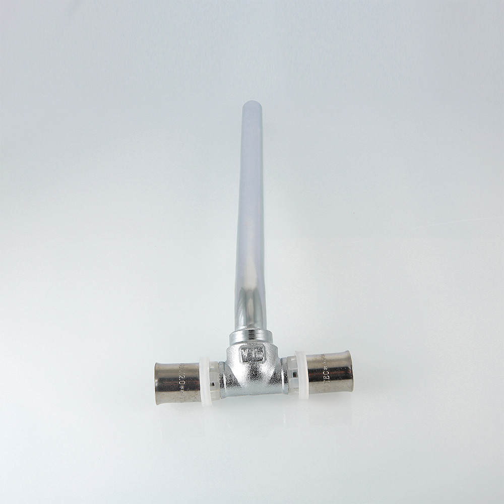 Пресс-фитинг – тройник с хромированной латунной трубкой (наружный диаметр – 15, толщина стенки – 1 мм), предназначенный для подключения отопительного прибора к разводке из металлополимерных труб, труб из сшитого полиэтилена PE-X и полиэтилена повышенной термостойкости PE-RT.