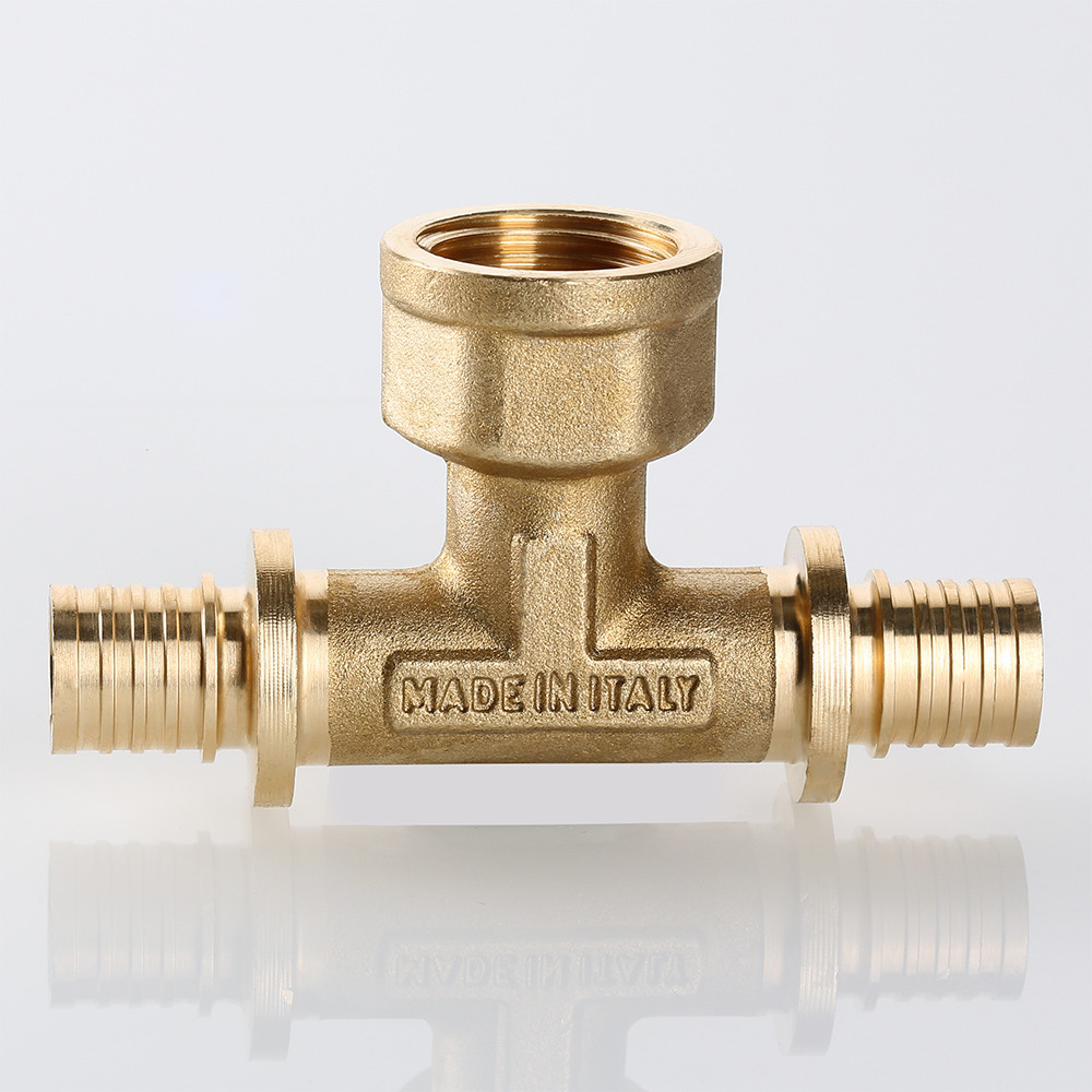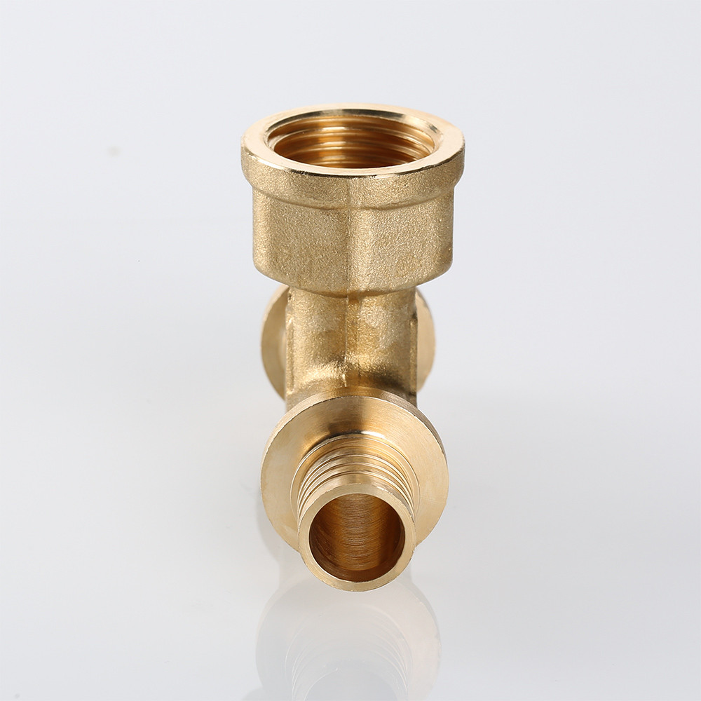 VTm.432.BG – трехсторонний латунный универсальный аксиальный фитинг с переходом на внутреннюю резьбу в центральном отводе, обеспечивающем присоединение к полимерному трубопроводу элемента системы с резьбовым патрубком.