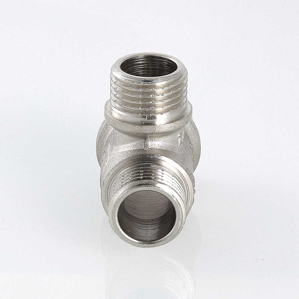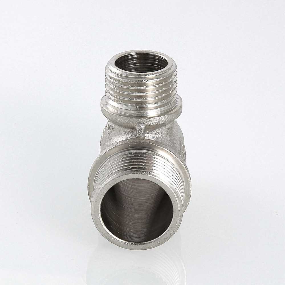Резьбовой фитинг – тройник переходной с наружной резьбой изготовлен из латуни марки CW617N методом горячего штампования с последующим нанесением никелевого гальванопокрытия. Применяется для создания разъемных резьбовых соединений на трубопроводах из стальных, медных, латунных, пластиковых и металлопластиковых труб. Комбинация присоединительных патрубков данной модели позволяет смонтировать участок трубопровода соответствующей конфигурации без дополнительных соединителей. Резьба фитинга – трубная цилиндрическая по ГОСТу 6357 (ISO 228, EN 10226), имеет насечки для эффективного удержания уплотнительного материала.
