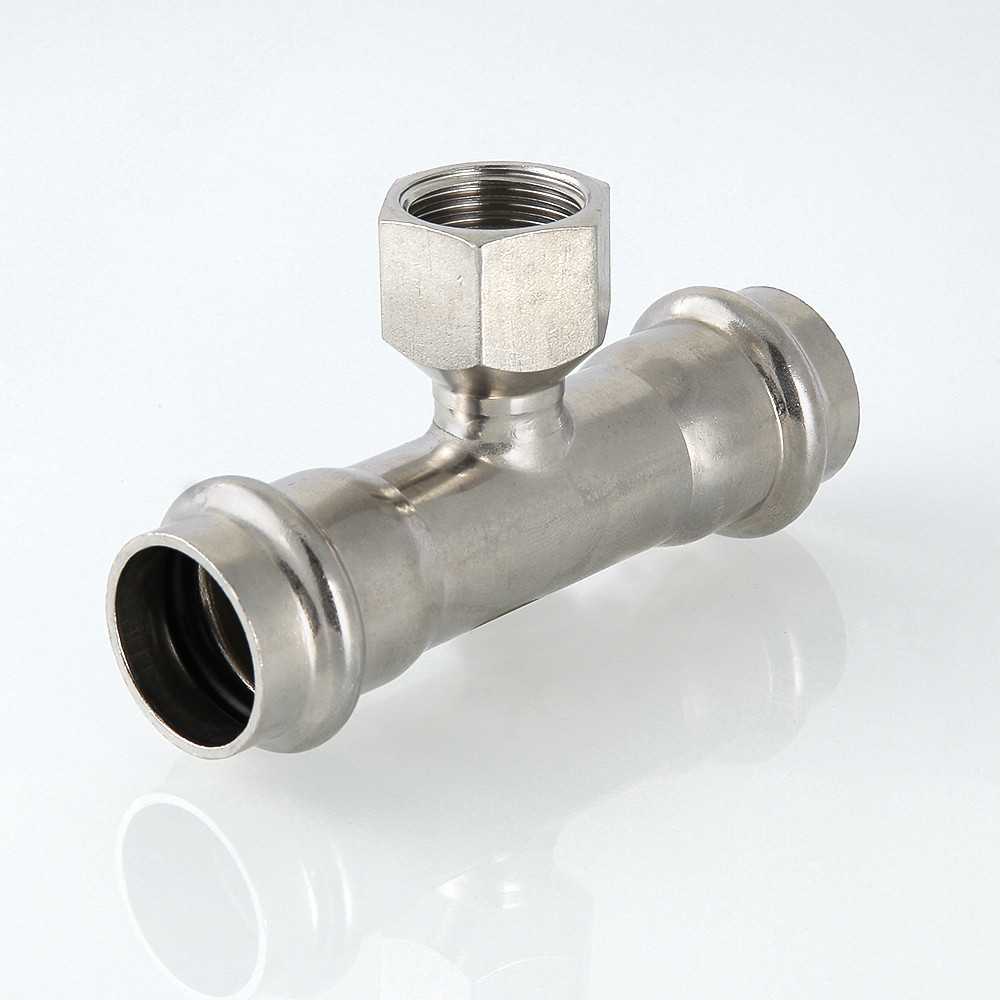 Пресс-тройник из нержавеющей стали с внутренней резьбой предназначен для соединения тонкостенных стальных труб с резьбовым элементом системы водоснабжения, отопления, других инженерных и технологических установок. Фитинг рассчитан на эксплуатацию при максимальной рабочей температуре 120 °С. Номинальное давление – 16 бар.
