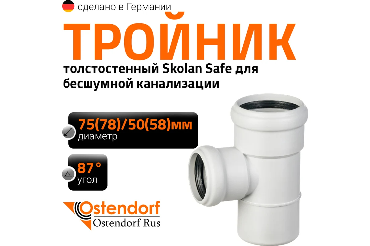 Тройник бесшумной канализации Ostendorf Skolan Safe предназначен для соединения отводных(дополнительных) линий трубопроводов и точек подключения сантехнических приборов в одну систему водоотведения под определённым углом.
