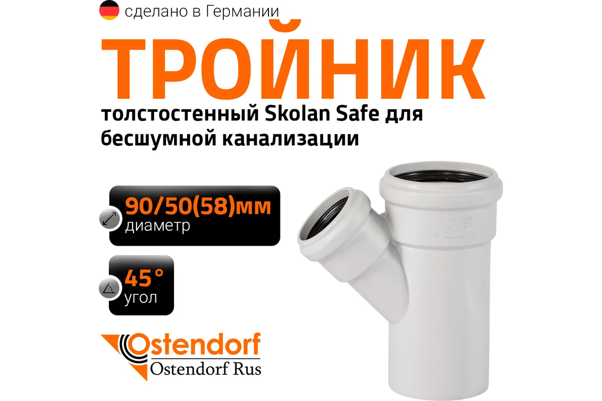 Тройник бесшумной канализации Ostendorf Skolan Safe предназначен для соединения отводных(дополнительных) линий трубопроводов и точек подключения сантехнических приборов в одну систему водоотведения под определённым углом.