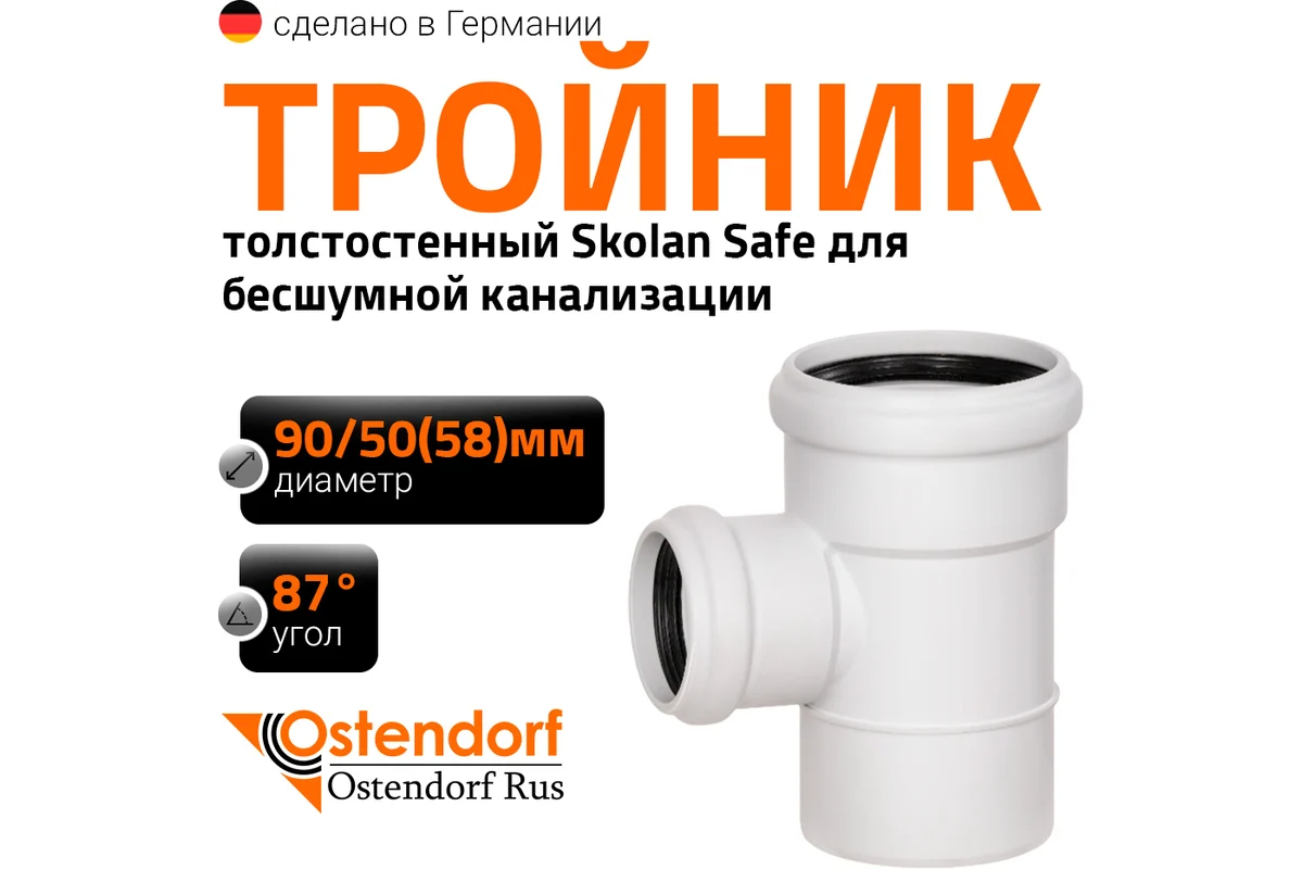 Тройник бесшумной канализации Ostendorf Skolan Safe предназначен для соединения отводных(дополнительных) линий трубопроводов и точек подключения сантехнических приборов в одну систему водоотведения под определённым углом.