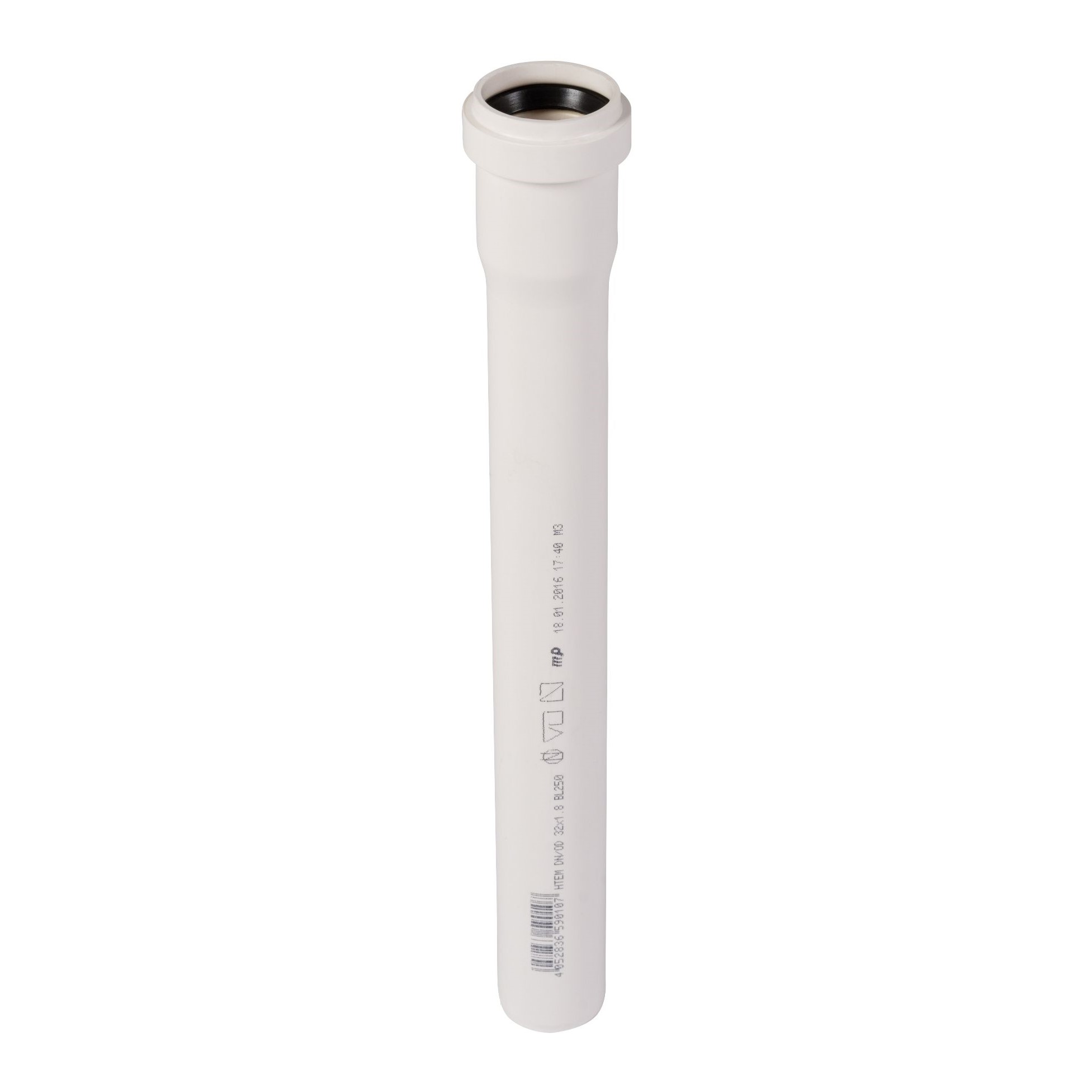 Долговечная маркировка с обозначением производителя, условного диаметра, стандарта (DIN EN 1451-1), даты изготовления (на фитингах дополнительно указываются углы наклона), на трубах нанесена сантиметровая линейка.