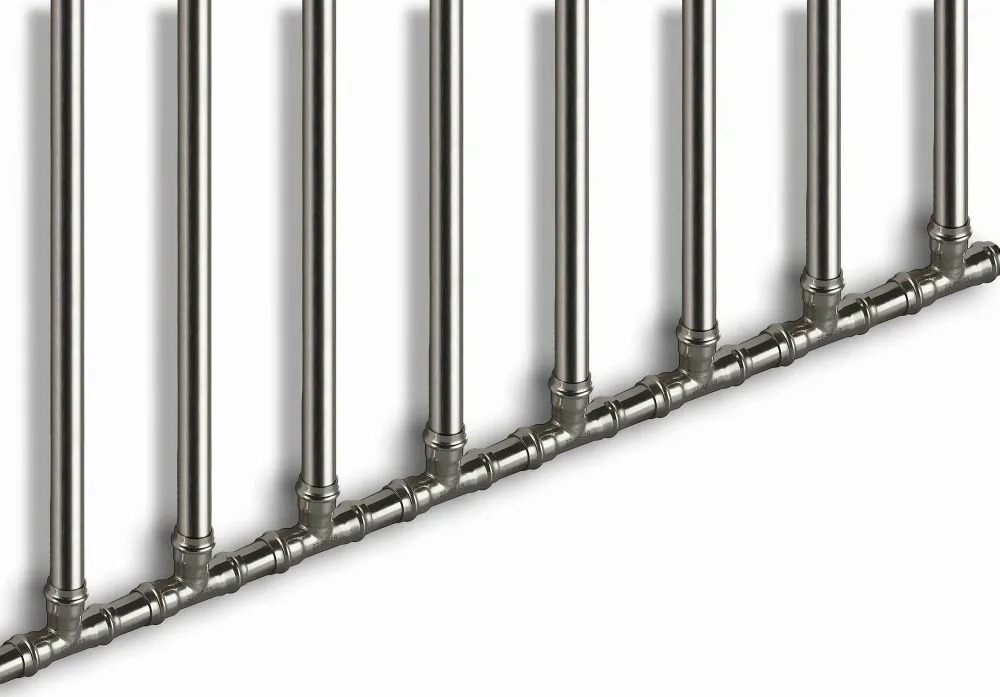 Трубы системы INOX-PRESS выпускаются из нержавеющей стали марки AISI 304, содержащей 18-20% хрома. Другими основными легирующими добавками служат никель(8-10,5%), магний(2%), кремний(1%). Такой состав обеспечивает металлу стойкость к коррозии, термическому и химическому воздействию, высокую прочность, пластичность и хорошую свариваемость. Сталь AISI 304 широко применяется в различных отраслях промышленности, включая пищевую и химическую. Благодаря относительно невысокой стоимости данный материал оптимален для использования в инженерных системах зданий. Трубы из нержавеющей стали характеризуются долговечностью, малыми гидравлическими потерями(благодаря этому квартирную разводку можно выполнить трубами наименьшего диаметра) и тепловым линейным удлинением, гигиеничностью, компактностью и эстетичностью. Соединение труб, подключение к арматуре, оборудованию осуществляется с помощью бесштуцерных пресс-фитингов.